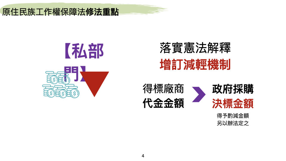 至於修正草案,原民會也點出其條文修正重點,包括:首先,公部門進用原住民族的職務類別不再限於「約僱等五類人員」,並將原住民族地區公部門進用比率原則設定為不得低於3%。第二,得標廠商應繳納的代金金額將不再超過政府採購決標金額的一定比率,以避免過苛情況。第三,公部門如進用困難致未達法定進用原住民比率者,將得以免繳代金。