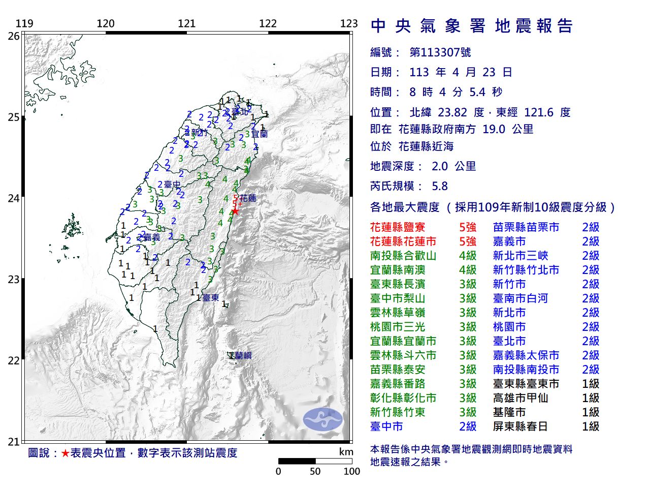 地牛翻身!根據中央氣象署地震測報中心資料,今天上午8時04分花蓮縣近海發生芮氏規模5.8地震,震央在花蓮縣政府南方19.0公里處,深度2公里,屬於極淺層地震。