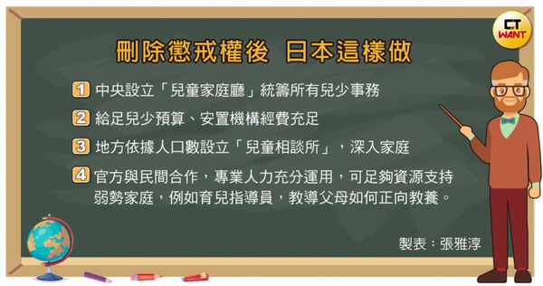 對這次修法,法務部指出是參考《兒童權利公約》第19條規定及相關一般性意見,符合日本及南韓近年來的相關修正,接軌國際潮流。周明湧抨擊只學半套,他以日本舉例,「日本於1994年簽署《兒童權利公約》,便在中央成立『兒童家庭廳』、在地方依據人口數設立『兒童相談所』,給足兒少安置機構經費,官方、民間一起協力合作。」