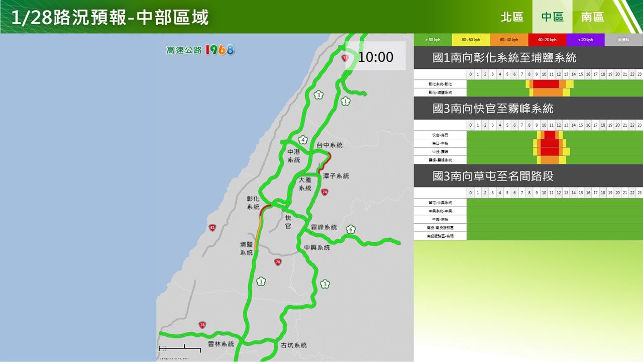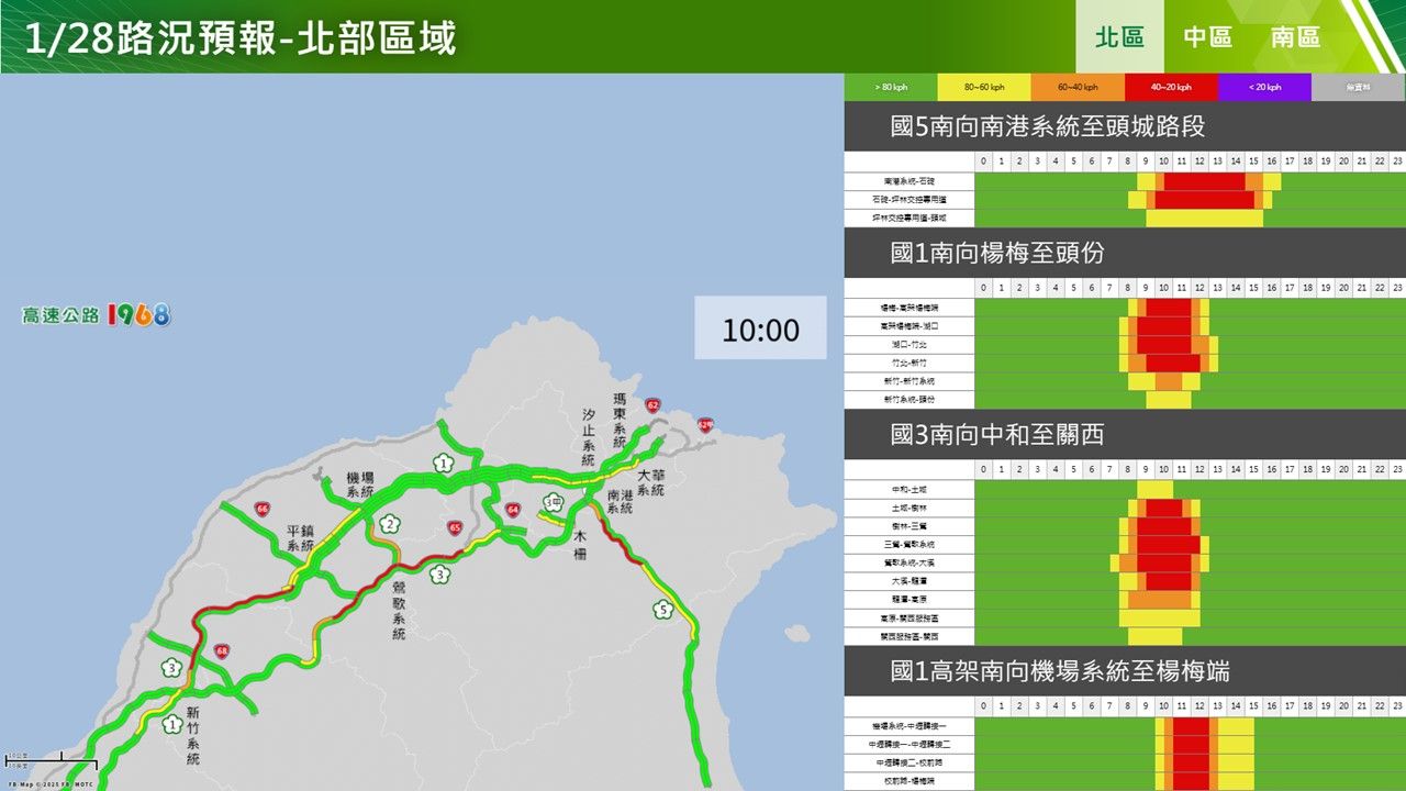 高公局預判,今日下午重點壅塞路段為「國5南向南港系統-頭城」、「國6西向舊正-霧峰系統」、「國10西向仁武至左營端」等路段,建議用路人透過高速公路1968網站、App或警廣掌握即時路況資訊,避開國道壅塞路段及時段。