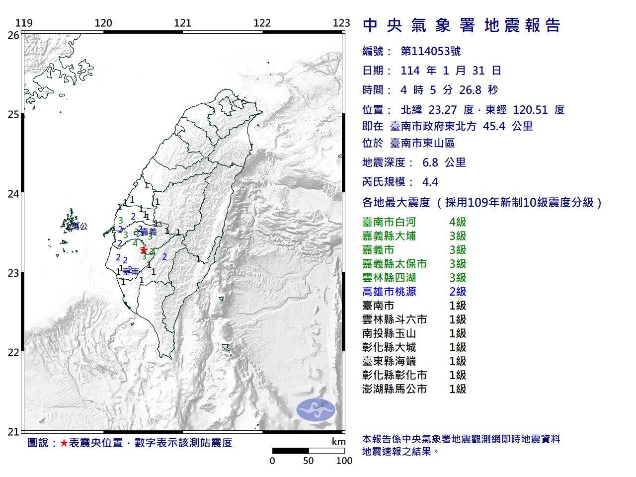 根據氣象署測報資料,震度4級地區為台南市,震度3級地區為嘉義縣、嘉義市、雲林縣,震度2級地區為高雄市,震度1級地區為南投縣、彰化縣、台東縣、澎湖縣。