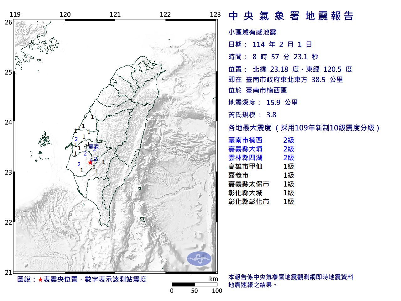 根據氣象署測報資料,震度2級地區為台南市、嘉義縣、雲林縣,震度1級地區為高雄市、嘉義市、彰化縣。