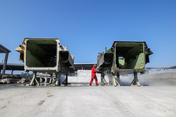 位於海軍左營基地的「海軍兩棲履車保修工廠」,是負責海軍AAV7兩棲突擊車維修與保養的重要單位。車輛轉場到履保廠的車身修護場之後,會先實施拆解,並將車殼及零附件,執行除漆及除鏽的工項;其中,AAV7車殼部分會使用高壓水刀進行除漆、除鏽作業,車殼處理過後的表面,技術人員會參照技術手冊,量測厚度及金屬耐用達原設計規範後,再接續進行次階段防護塗裝作業。