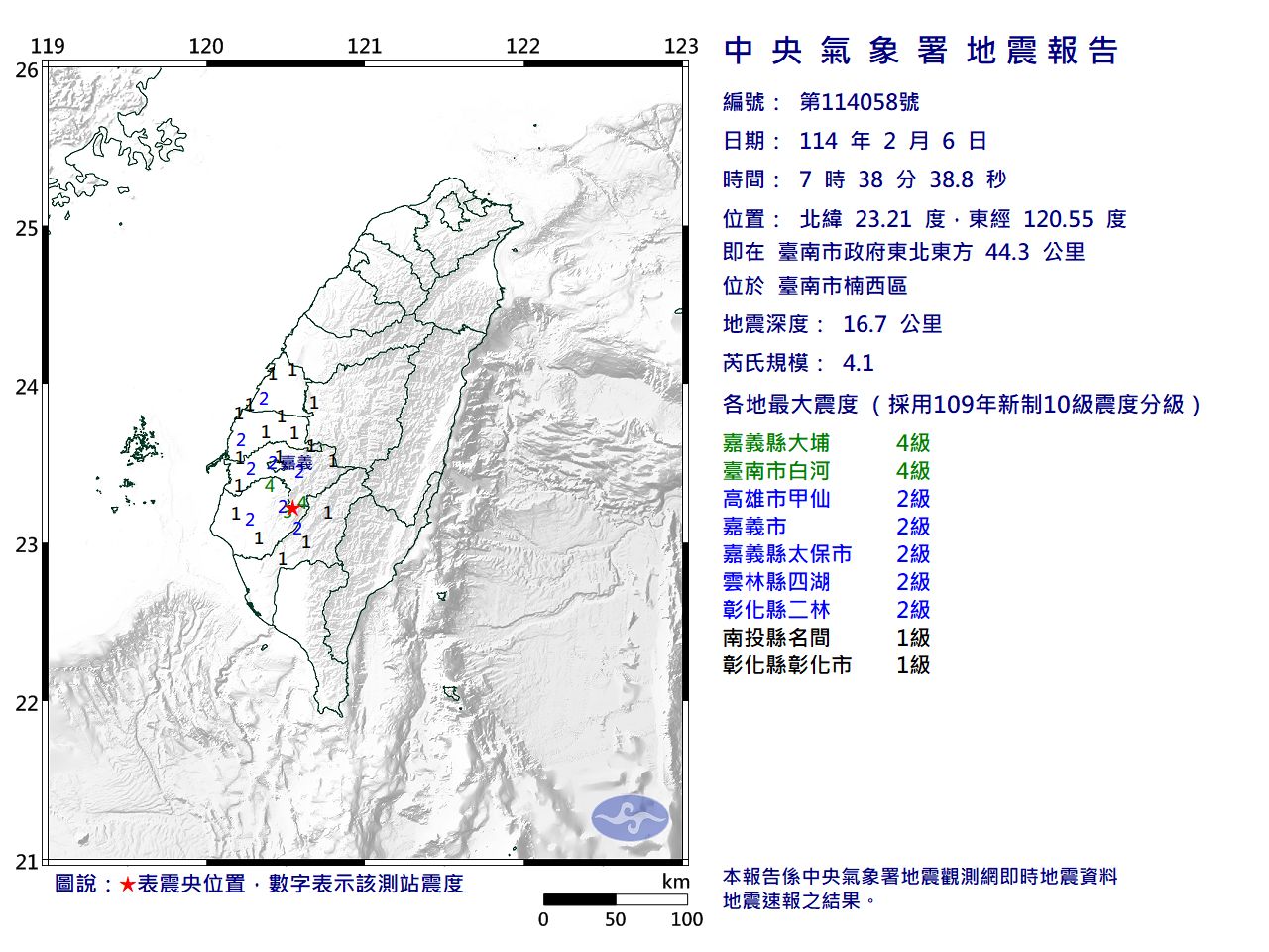 根據氣象署測報資料,震度4級地區為嘉義縣、台南市,震度2級地區為高雄市、嘉義市、雲林縣、彰化縣,震度1級地區為南投縣。
