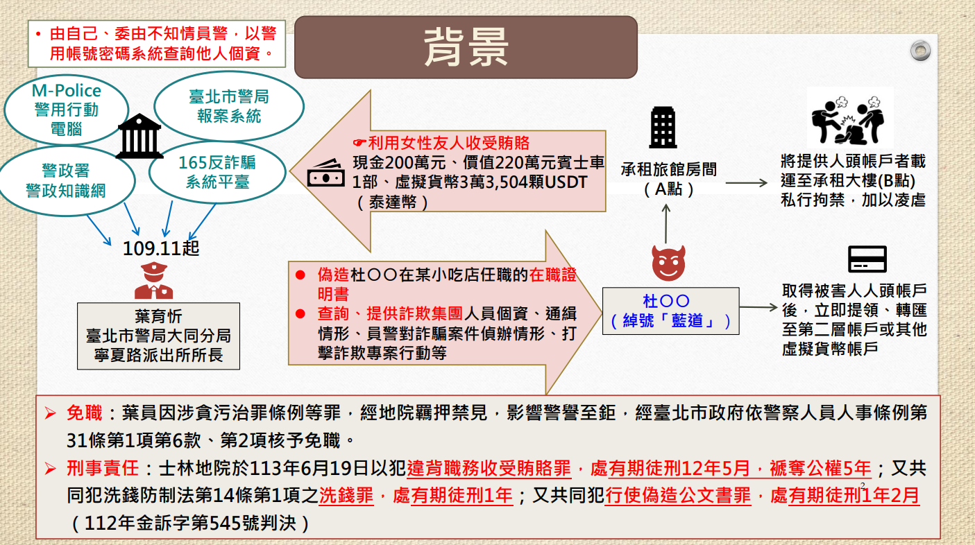 回顧案件,葉育忻(下稱葉員)自109年11月擔任寧夏路派出所所長起,共17次違法查詢詐欺集團人員之個資、通緝情形、內政部警政署打擊詐欺專案行動期間及內容等訊息,洩漏予詐欺集團首腦藍道知悉,以利其有所防範,並製作不實的法院交保單,供藍道使用,期間陸續收受賄款約200萬元現金、賓士自小客車1輛。