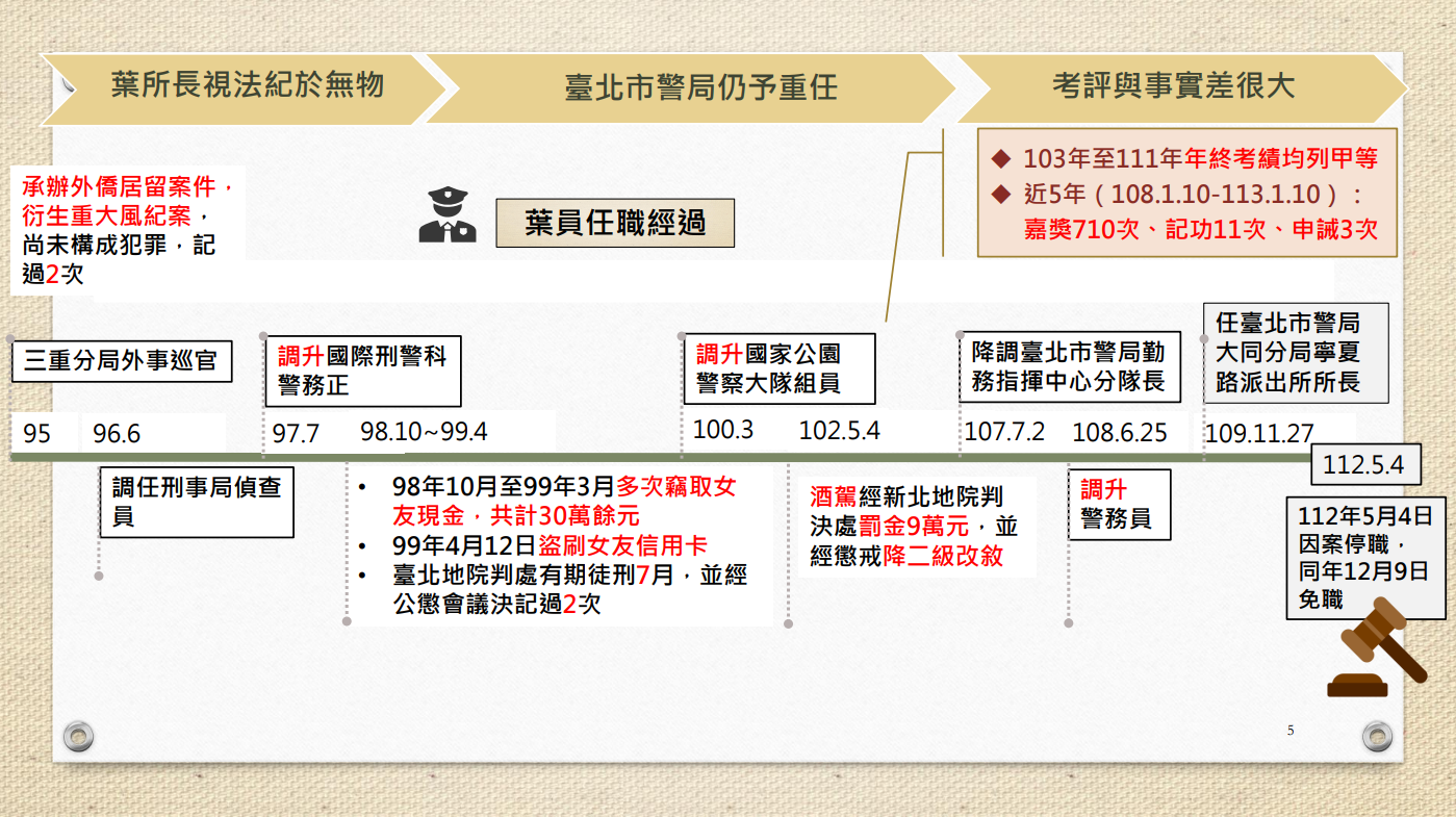 監委表示,葉員任所長期間即長期勾結詐欺集團,台北市政府警局雖表示案發前未接獲有關葉員之檢舉或風紀情資,然葉員既有多次違法違紀紀錄,該局仍遴選任用為派出所所長之重要警職,另查葉員109年至112年年終考績均列甲等,品德操守欄皆勾選A(優異),主管綜合考評均極為肯定,相關評語為「領導統御佳」、「潔身自愛,風評良好」、「廉潔自持,能恪遵各項風紀要求」等,與事實差距極大。
