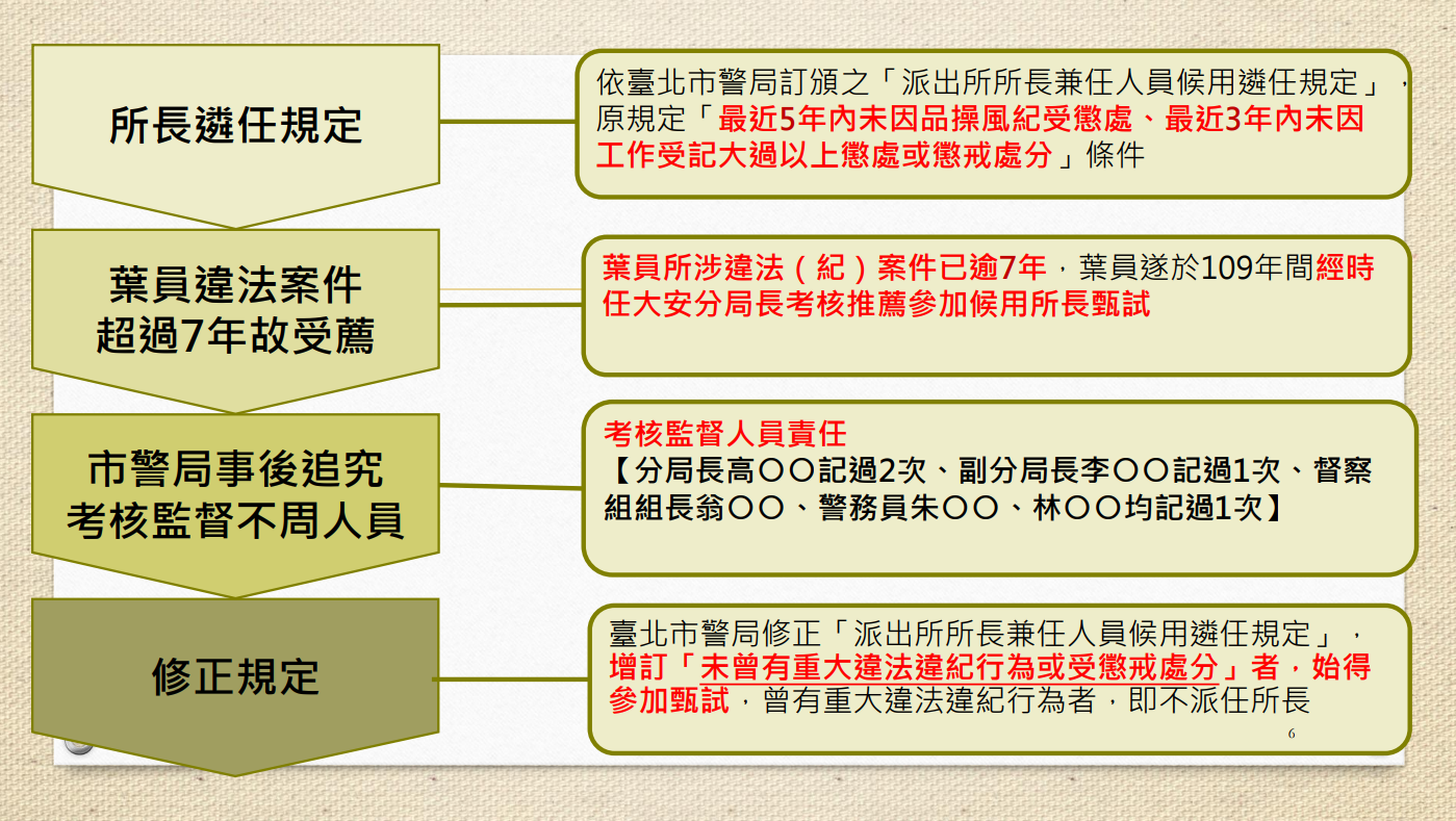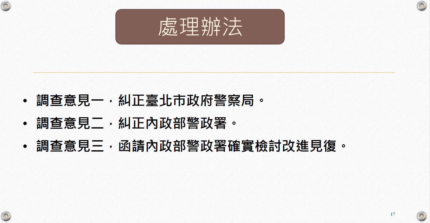 監委表示,本院審酌認為各項風紀內控機制如有發揮基本作用詳為考察,理應發現諸多異常,惟台北市警局對於重要警職幹部風紀考核流於形式、防弊功能無法有效發揮,致生重大警紀案件,台北市政府警察局核有重大違失。