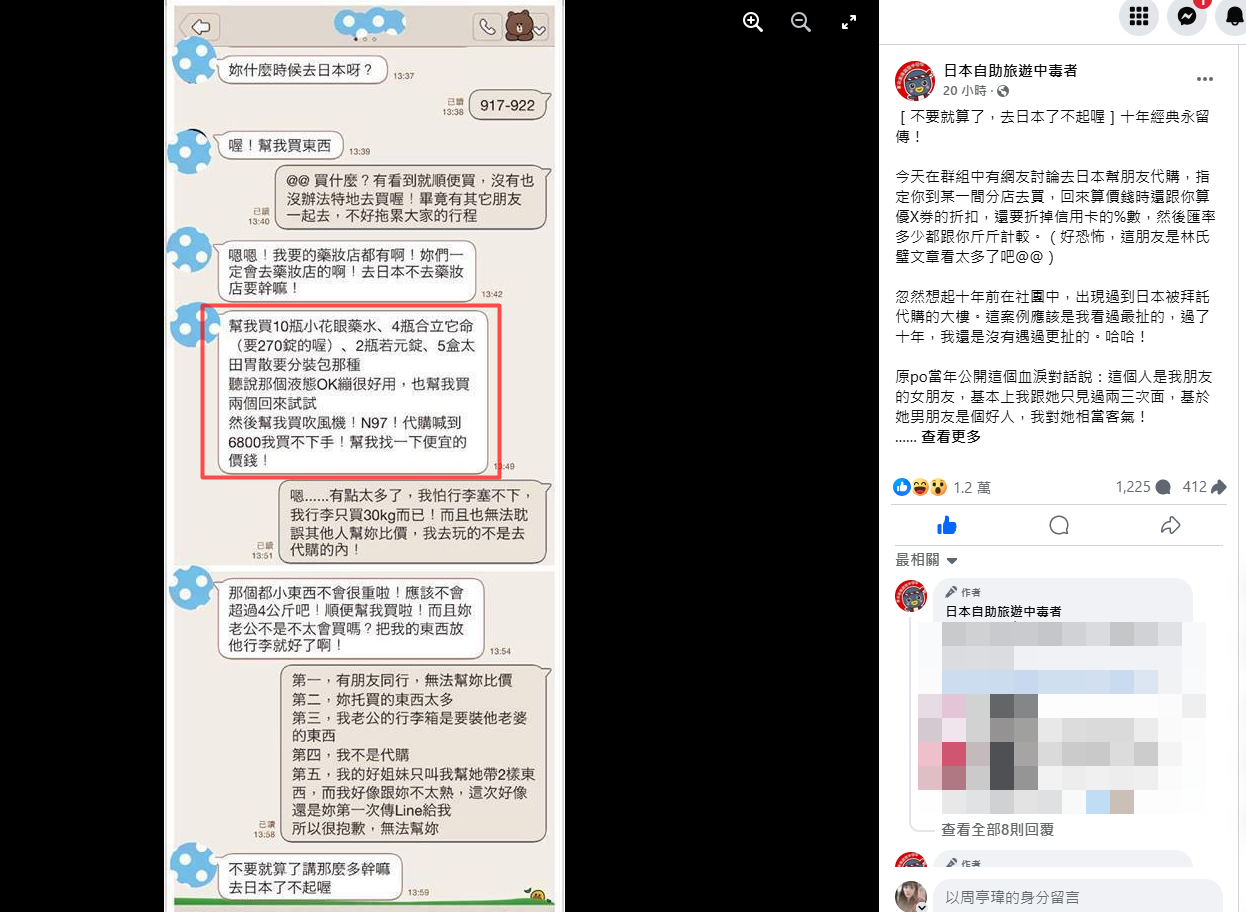 林氏璧昨日在粉專「日本自助旅遊中毒者」發文提到,今天在群組中,有網友討論去日本幫朋友代購,被指定到某一間分店去買,回來算價錢時,還算優X券的折扣,更扣掉信用卡的回饋%數,然後匯率多少也都斤斤計較,這讓他不禁想起10年前的一段對話,「這案例應該是我看過最扯的,過了10年,我還是沒有遇過更扯的!」