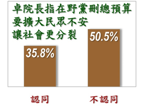 根據《美麗島電子報》調查,詢問民眾「行政院提出中央政府總預算金額比去年多9.8%,結果被立法院刪減6.6%後通過,刪減幅度歷年最高,但是通過的總預算增加729億也是歷年最多。朝野政黨對刪減的項目有爭論,行政院長卓榮泰說在野黨要擴大民眾不安讓社會更分裂,您認不認同這種說法」,結果顯示,有35.8%認同卓榮泰說法,其中15.8%很認同、20.0%還算認同,另外,50.5%不認同,其中25.8%很不認同、24.7%有點不認同,未明確回答的有13.7%。