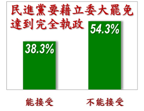 另外,根據《美麗島電子報》調查,詢問民眾「民進黨為了罷免在野黨立委,安排部會首長和立委在縣市舉辦說明會,打算透過補選在立法院得到超過一半的席次,然後換掉立法院長韓國瑜,民進黨就可以完全執政。在這種方式下,您能不能夠接受賴總統和民進黨的完全執政」,結果顯示,38.3%民眾能夠接受,其中19.8%很能接受、18.5%還算能接受,另外有54.3%不能接受,其中38.5%很不能接受、15.8%有點不能接受,未明確回答的有7.3%。