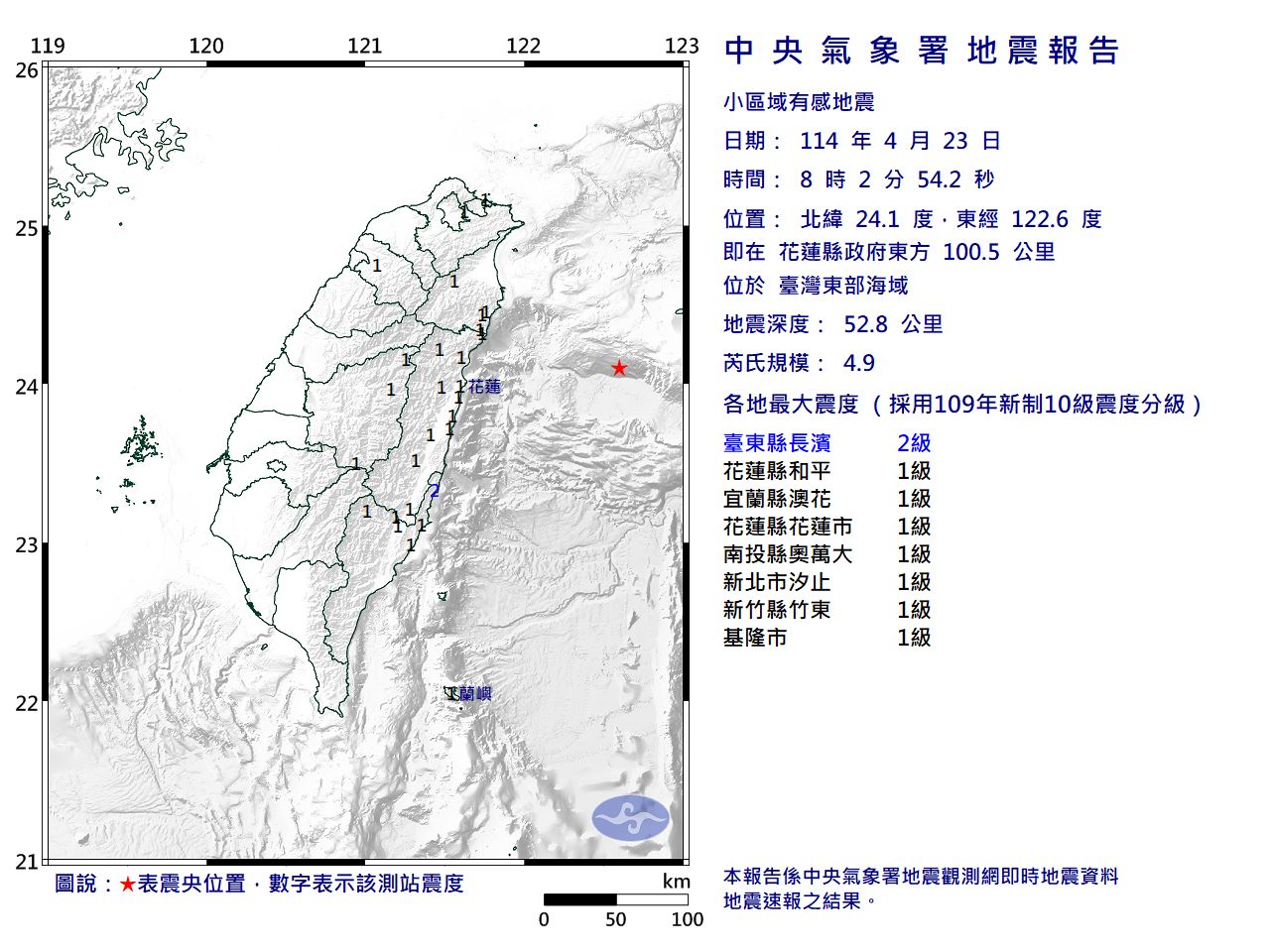 根據氣象署測報資料,震度2級地區為台東縣,震度1級地區為花蓮縣、宜蘭縣、南投縣、新北市、新竹縣、基隆市。
