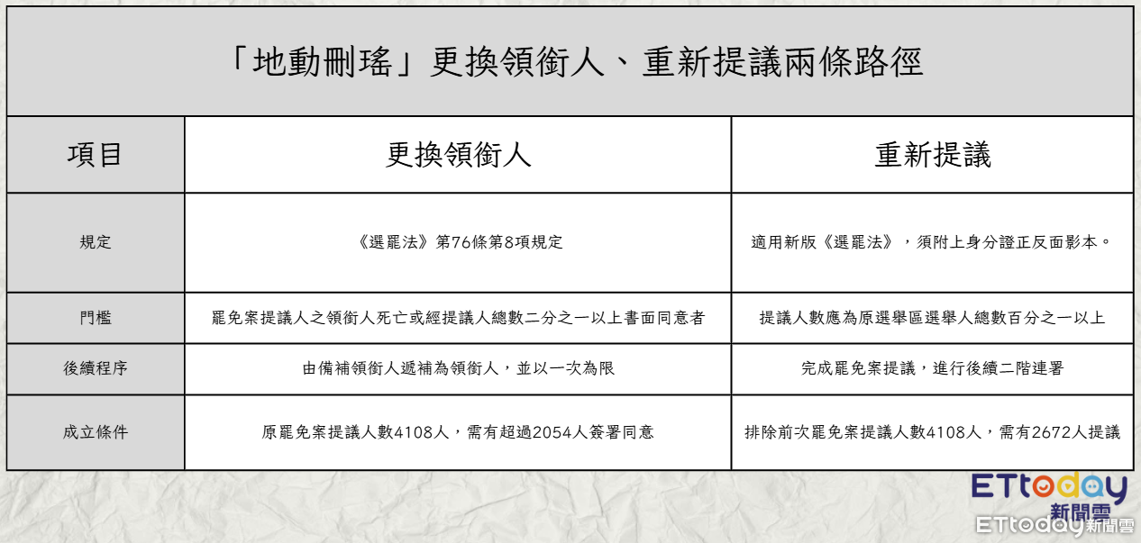 一旦「地動刪瑤」確定更換領銜人,必須要「一階合格提議人數」4108人的二分之一以上同意,也就是超過2054人「簽署同意書」,接近將1階段連署推倒重來,不僅過程繁瑣,考量該罷免案連署截止日為6月7日,恐將影響二階段連署進度。