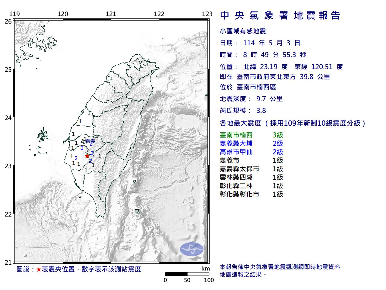 氣象署指出,這起地震觀測到最大震度為3級,出現在台南市楠西。