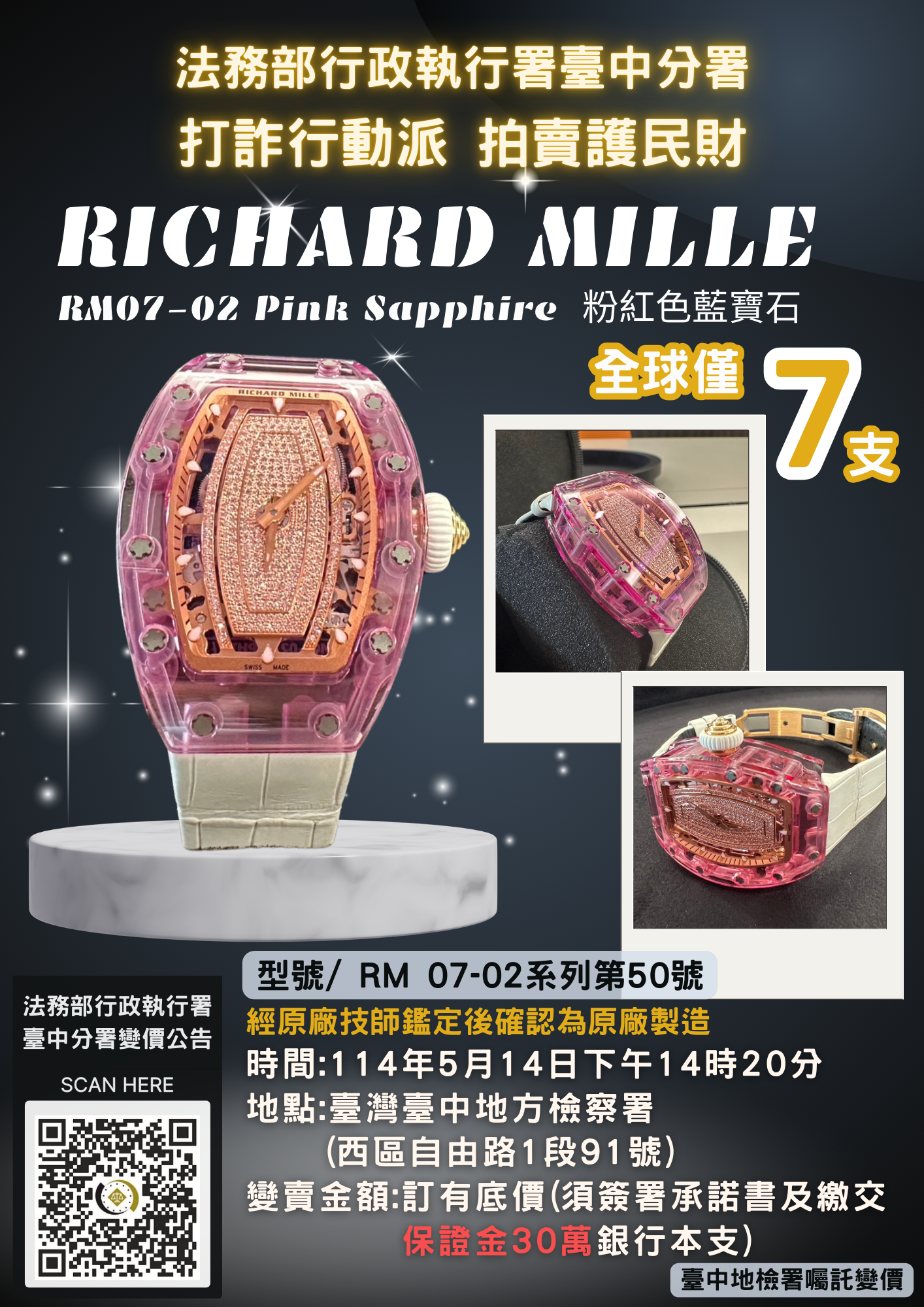 法務部行政執行署台中分署說,本次受台中地檢囑託,辦理偵辦中案件之查扣物「Richard Mille 07-02粉色鑲鑽腕錶」變價拍賣,價值約莫3千萬、近乎一戶都會區豪宅,為歷年來單一物件價值之最。