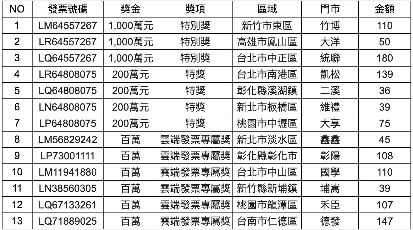 財政部最新一期114年3至4月統一發票已在昨天開獎,7-ELEVEN 今(26日)公布,這期開出3張1千萬元特別獎、4張200萬元特獎、6張雲端發票專屬獎100萬元,共有13名幸運兒。其中一名超級幸運兒只花50元就中1千萬元,還有一位只花36元就中200萬元。