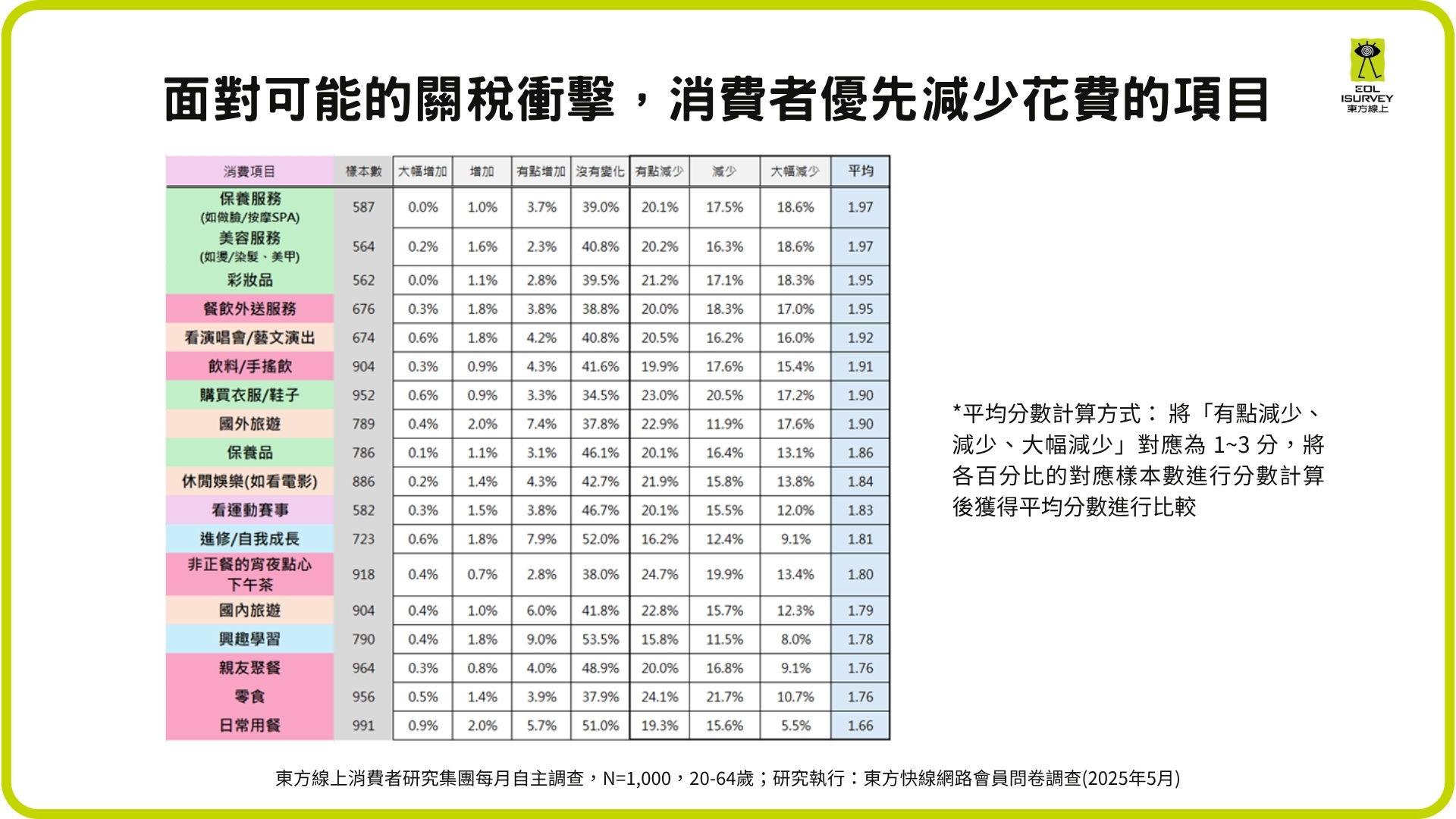 東方線上表示,面對關稅可能帶來的衝擊,台灣民眾普遍以保守態度應對,優先削減非必要支出,並展現世代間消費心理的差異。品牌業者若能藉此洞察消費者行為,採取分眾策略並避免大幅調漲價格,可望在關稅壓力下保持市場競爭力。
