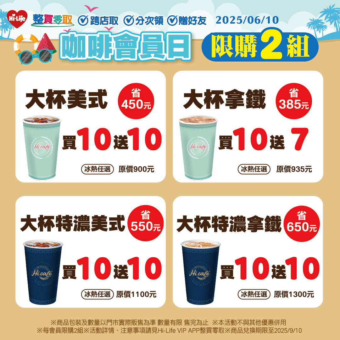 萊爾富在6月10日推出「咖啡會員日」,Hi-Life VIP APP專屬「整買零取」限時優惠,Hi café指定咖啡「買10送10」包括:Hi café系列大杯美式(原價45元)、大杯特濃美式(原價55元)、大杯特濃拿鐵(原價65元),通通買10送10;另有大杯拿鐵(原價55元)買10送7。