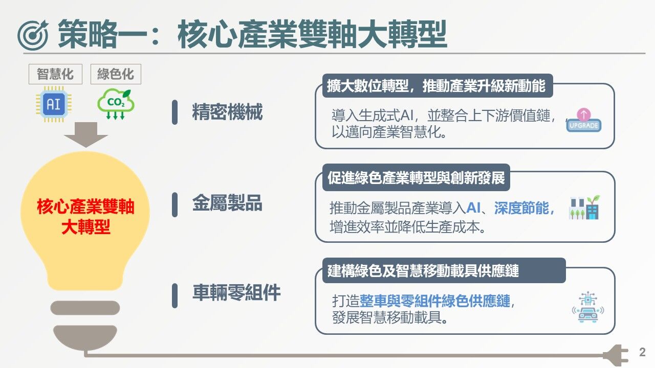 卓榮泰指出,政府規劃透過「核心產業雙軸大轉型」、「現有核心再造新核心」及「運用法人驅動產業創新」三大策略,以不同層次的策略,除進一步提升精密機械、半導體、光通訊等產業優勢,也將完善產業發展所需的生活機能,讓國內外人才匯聚,塑造中彰雲投成為全球領先的精密智慧新重鎮。