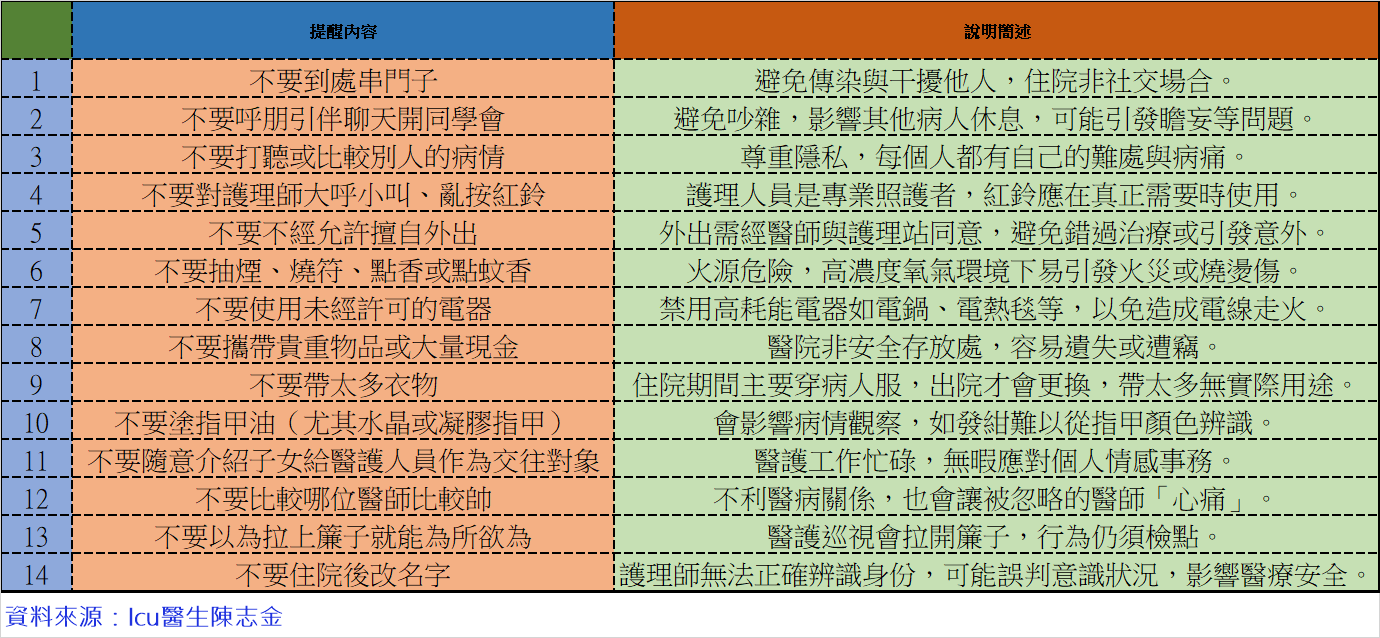 ▼ICU醫師陳志金整理住院14項NG行為。點圖可放大。(圖/ETtoday製表)