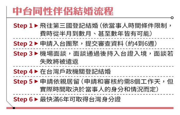 中台伴侶結異性婚,台方需先至中國結婚,同性伴侶則需到境外第三地結婚,再向台灣政府申請團聚入台、依親居留。