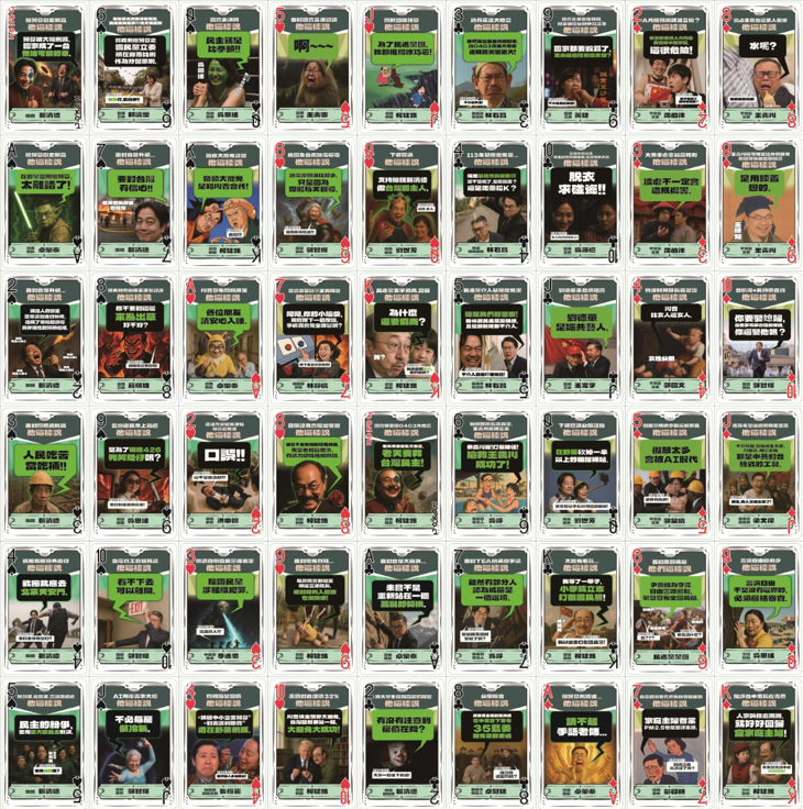 「幹話最多的,就是賴清德」,王育敏說,在修財劃法時,賴說民主的紛爭要用更大的民主解決,結果現在的團結十講,是他口中更大的民主是鬥爭,用政治報復的動作來拖垮在野黨。因此國民黨團搜集了民進黨政治人物過去所講的不恰當的話,都在撲克牌裡面,會發送給委員,明天開始民眾可以跟各委員辦公室索取,目前製作一萬份。