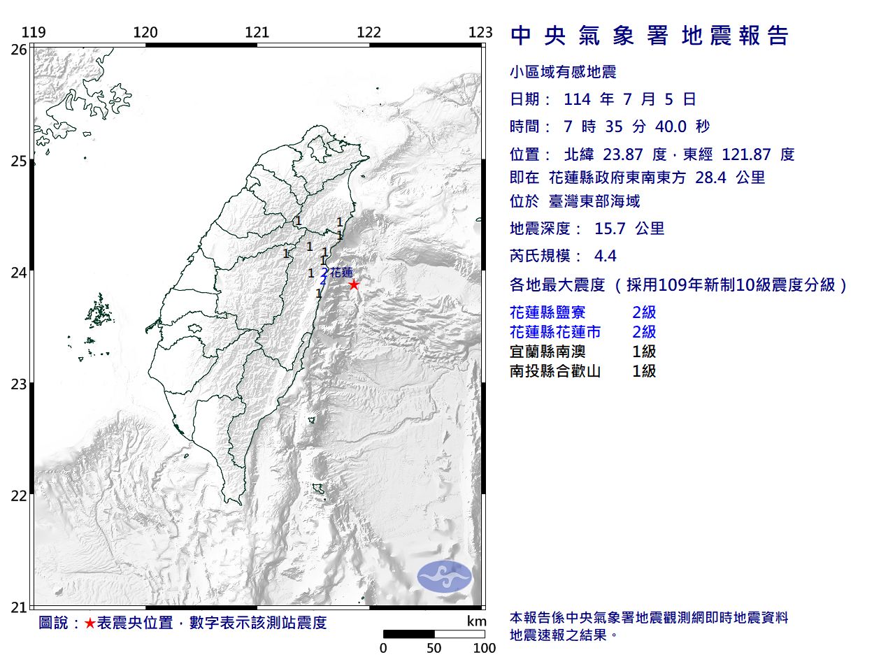 花蓮一早連二震!根據中央氣象署地震測報中心資料,今天上午7時35分台灣東部海域發生芮氏規模4.4的小區域地震,震央在花蓮縣政府東南東方28.4公里處,深度15.7公里,屬於極淺層地震。