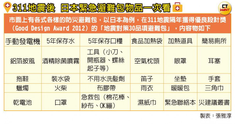根據日本媒體報導,避難包內容物大致可分成3種類型,第一種是危急時刻抓了就逃的避難包,所以裡面只能放入最救命的道具,包括(手機)充電器、手電筒、雨具、急救用品、個人藥品、眼鏡、零錢以及最小限度的食物飲品。