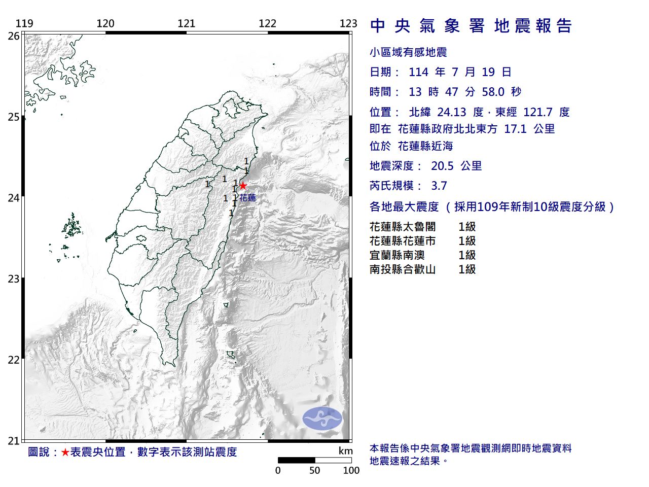 地牛翻身!根據中央氣象署地震測報中心資料,今天下午1時47分花蓮縣近海發生芮氏規模3.7的小區域地震,震央在花蓮縣政府北北東方17.1公里處,深度20.5公里,屬於極淺層地震。