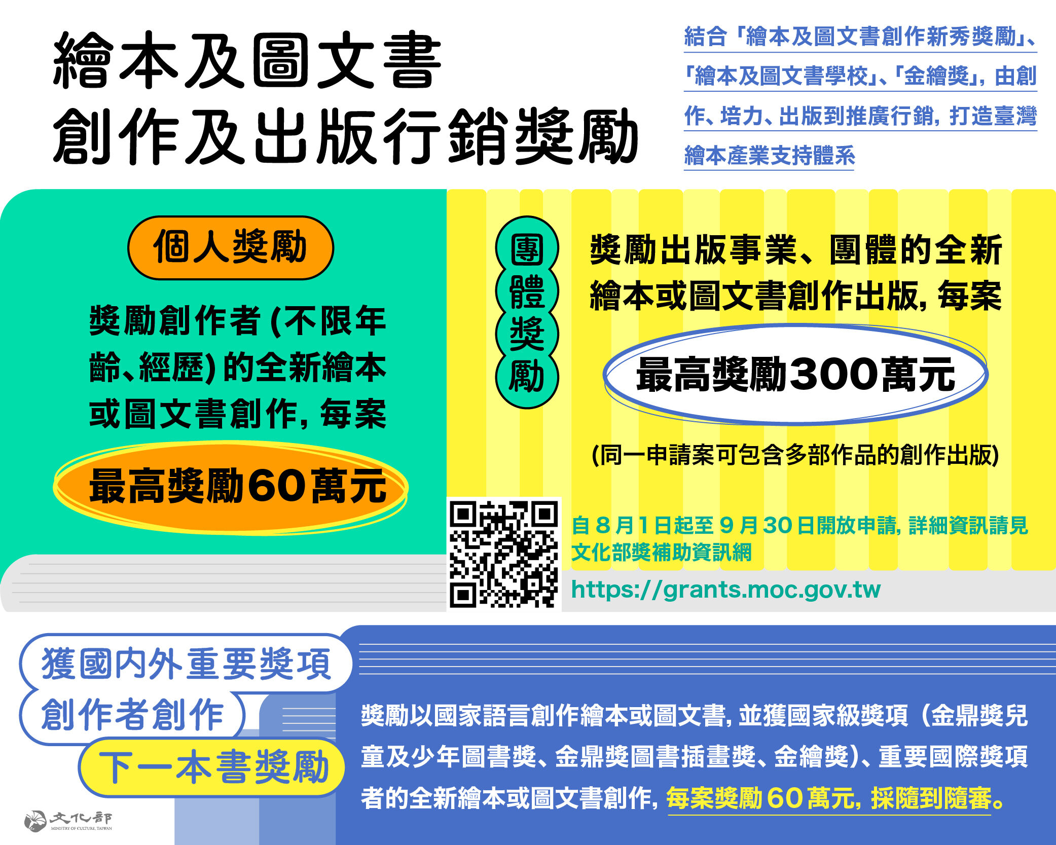 為支持國內繪本及圖文書創作,文化部新增「繪本及圖文書創作及出版行銷獎勵要點」,開放出版社或不限年齡、出版經歷的創作者申請,自8月1日起至9月30日開放受理,分為「個人獎」、「下一本書獎」最高60萬元獎勵金,「團體獎」每案最高300萬元獎勵金。
