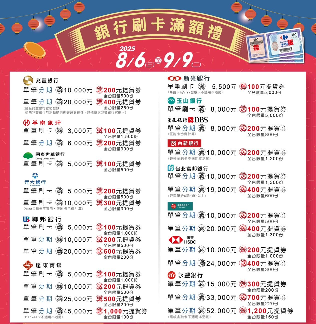 家樂福除了與14家銀行合作刷卡回饋,也提供堪稱通路最多元支付服務,並加碼天天8%省錢回饋。即日起至9月30日間,每日使用「銀聯卡(UnionPay)」結帳,量販店單筆滿2,500元現折200元,超市店滿600元現折50元(每日限一次,回饋不累計)。