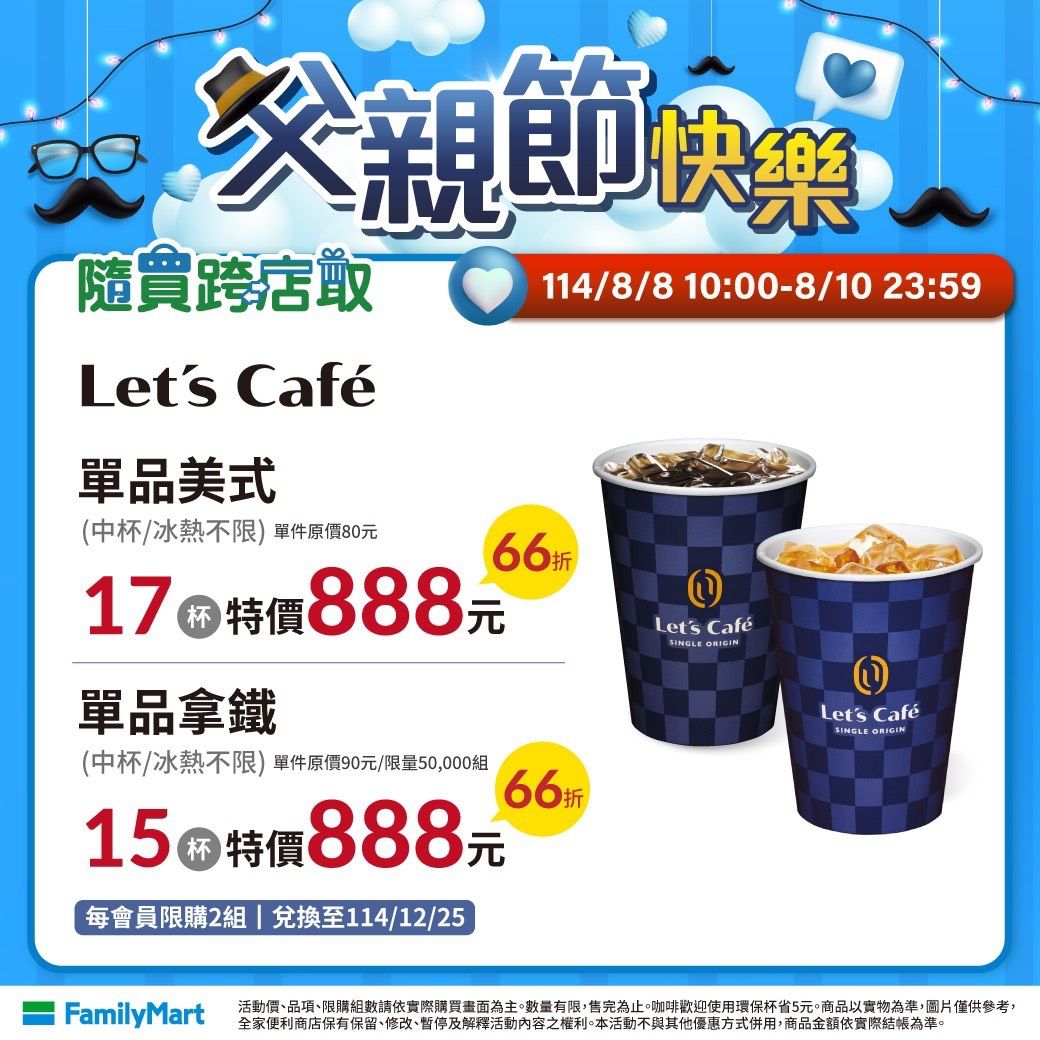 迎接父親節,超商陸續祭出優惠,感謝爸爸們平時的辛勞!7-ELEVEN推出咖啡、飲品寄杯「買8送8」,全家也有特濃美式25杯888元、特濃拿鐵21杯888元,周末五六日更有霜淇淋買1送1。OKmart 也在8月8日當天推出大杯莊園美式/拿鐵、極淬莊園美式/拿鐵,同品項「買2送2」,雲端商城限時「買10送10」。