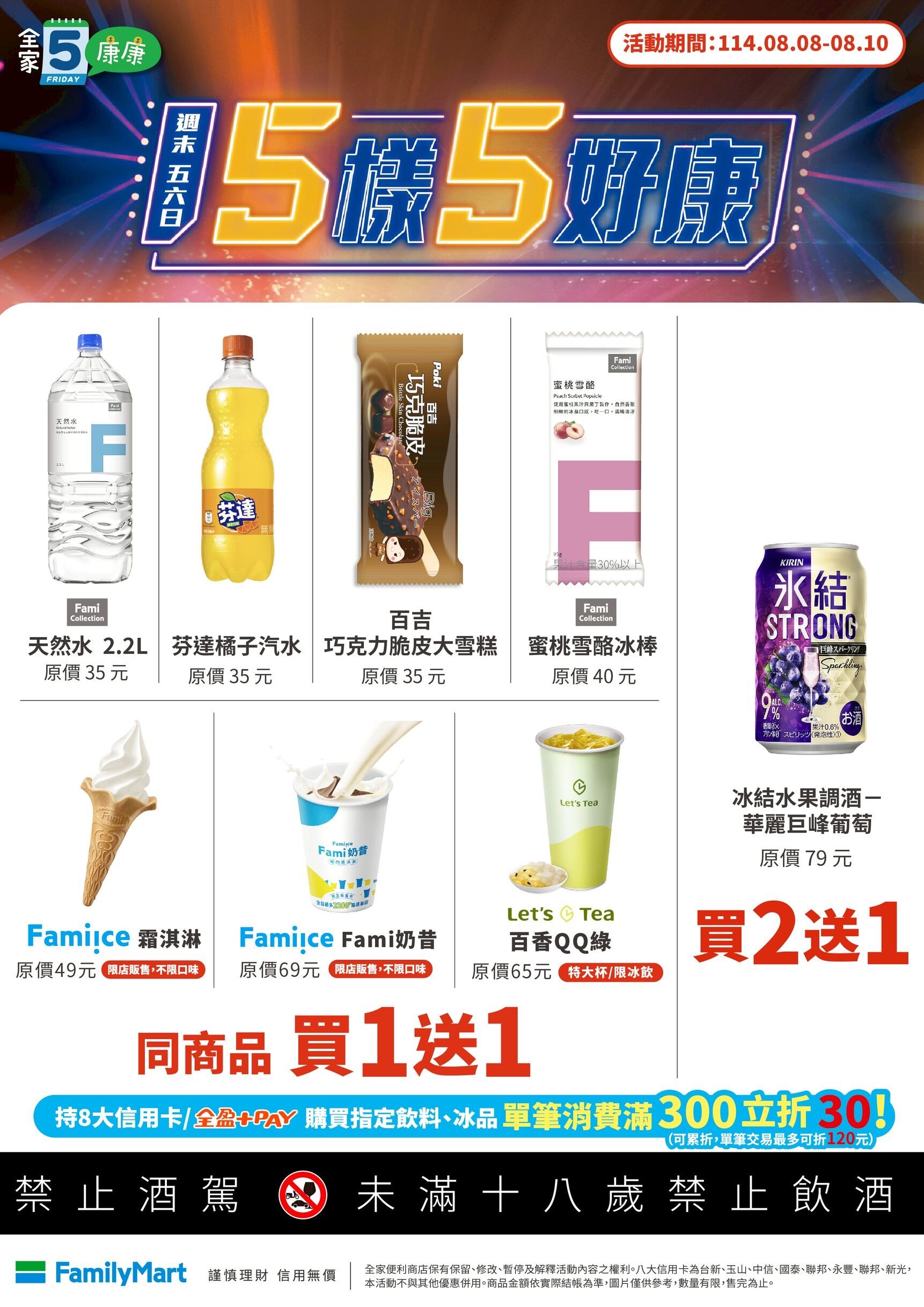 全家8月8日至8月10日「康康5」優惠,將推出霜淇淋、芬達橘子汽水、蜜桃雪酪冰棒、百吉巧克力脆皮大雪糕、Fami奶昔、Let's Tea百香QQ綠、天然水等,同品項「買1送1」。