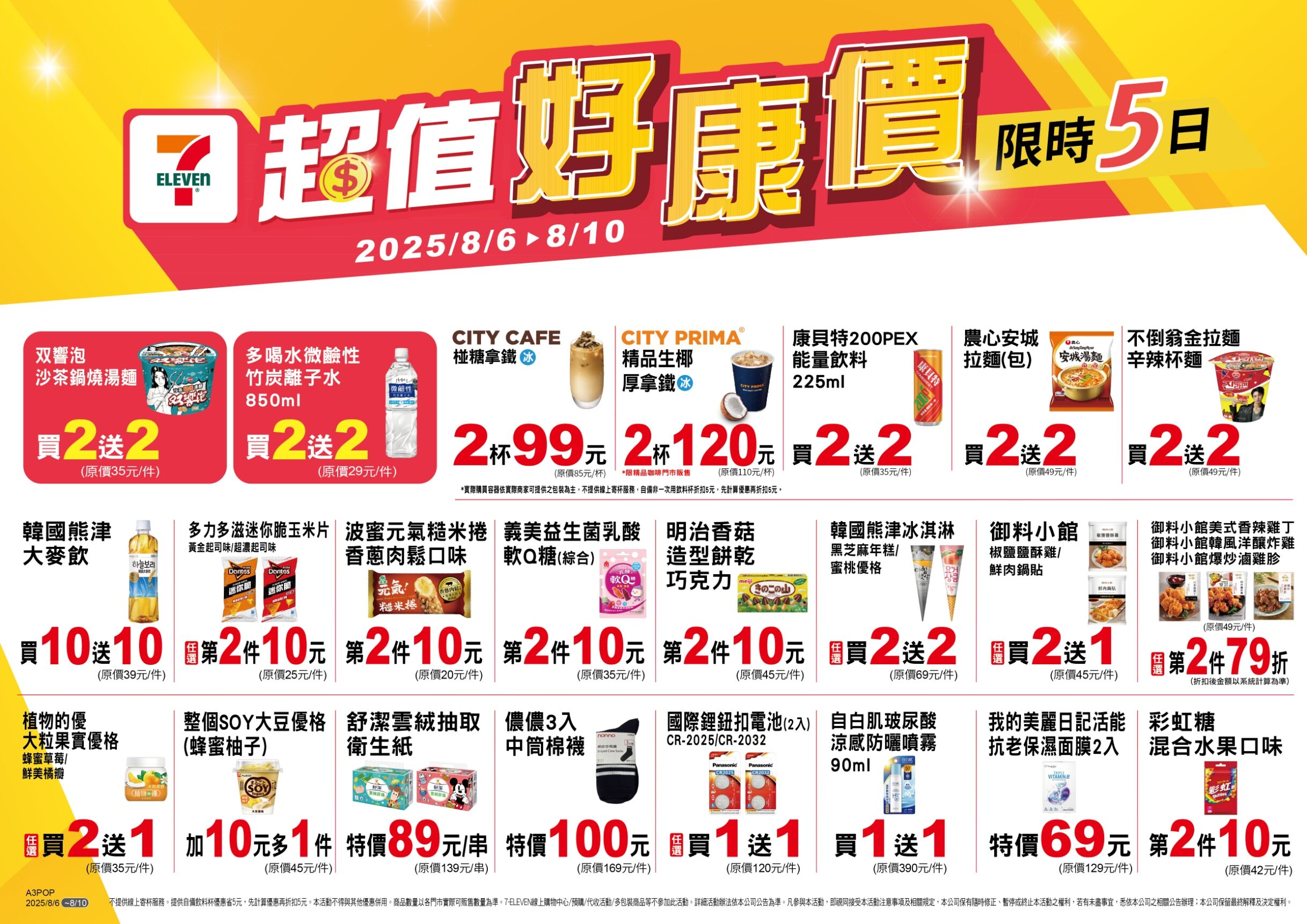 7-11自即日起至8月10日推出「超值五六日」,多項商品買2送2。周末也祭出多項優惠,涵蓋咖啡飲品、麵包烘焙、涼麵輕食、冰品水果。