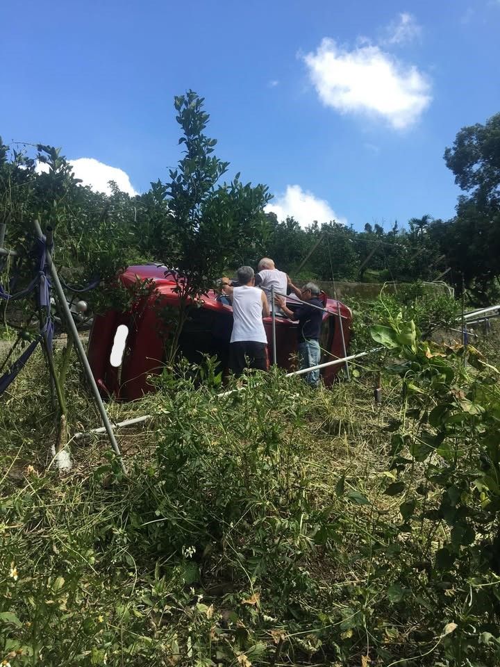 ▲▼87歲莊姓老翁疑路況不熟在小路轉彎處滑落邊坡翻覆,在熱心民眾協助下脫困。(圖/民眾提供)