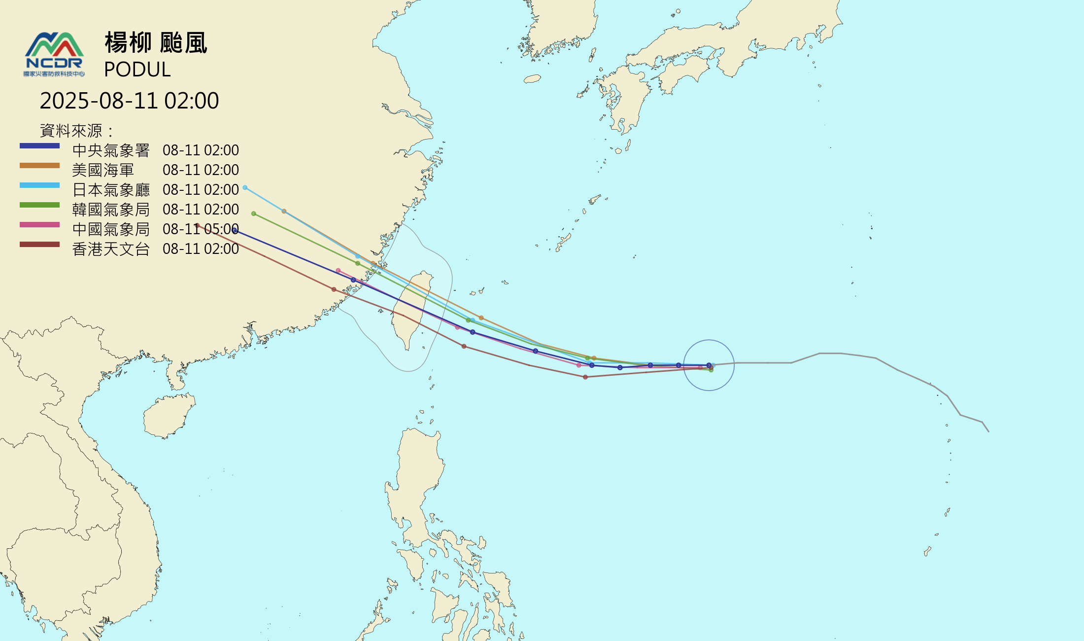 ▲而最新各國官方預報路徑,都預估楊柳將穿過台灣上空。(點圖可放大/NCDR)