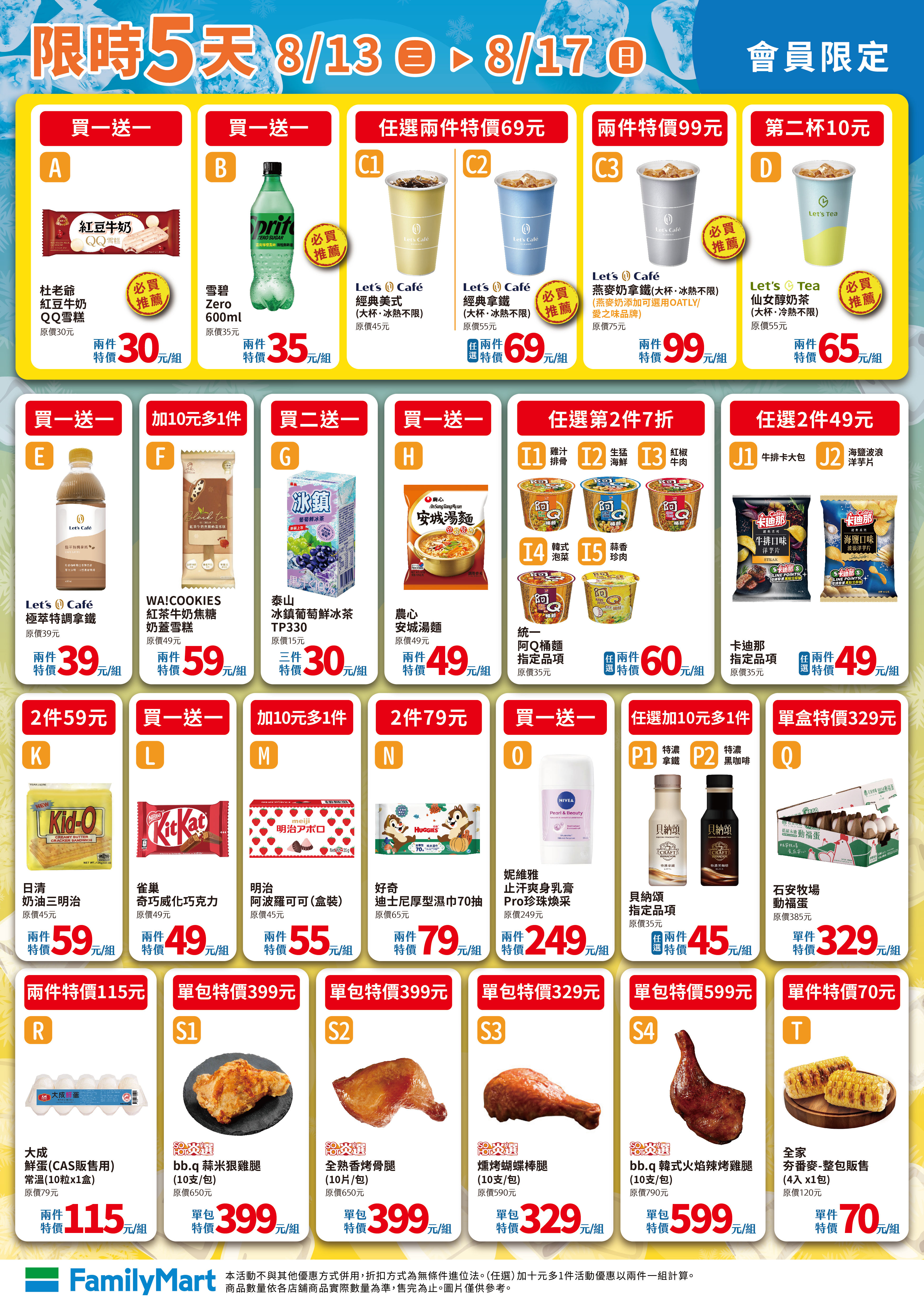 全家便利商店自8月13日至8月17日推出「會員限定優惠」,咖啡、冰品、零食通通折扣,多款直接「買1送1」。像是杜老爺紅豆鮮奶QQ雪糕、雪碧Zero 600ml、KitKat巧克力、農心安城湯麵,生活用品有止汗爽身乳膏等,通通「買1送1」。