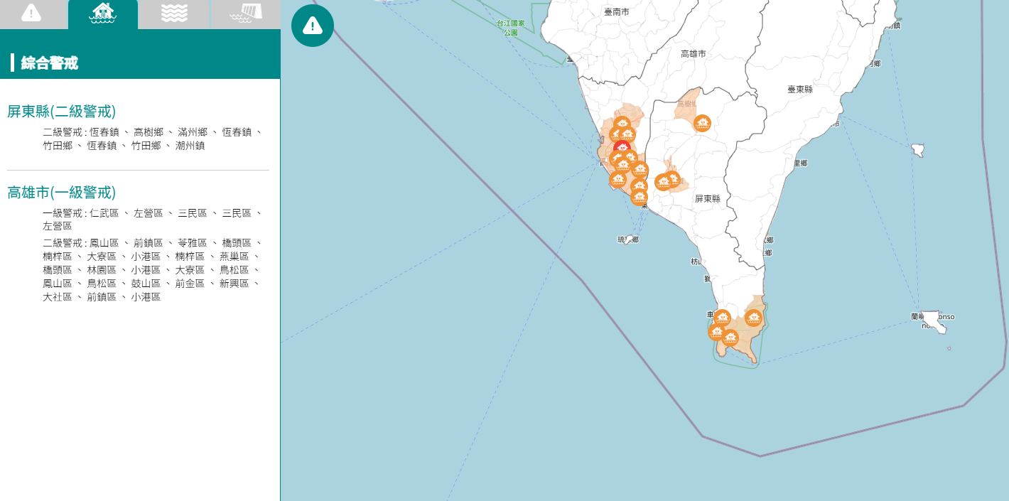高雄市的一級警戒範圍涵蓋仁武區、左營區與三民區等地,當地居民需特別留意防洪與避險措施。除此之外,高雄市還有包括鳳山、前鎮、苓雅、橋頭、小港、楠梓、燕巢、梓官、林園、大寮、岡山、旗山、新興、大社等多區被列為二級警戒。