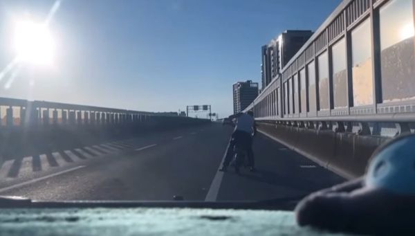 ▲台南阿北19日清晨騎電動輔助自行車誤入台86快速道路,險象環生。(圖/記者林東良翻攝)