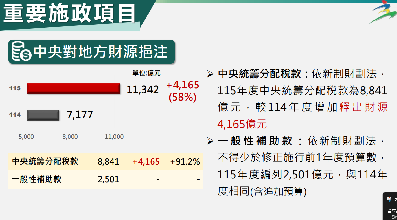 主計總處表示,依新修正的財劃法,115年度中央統籌分配稅款為8841億元,較114年度增加釋出財源4165億。一般性補助款部分,依新制財劃法,不得少於修正施行前1年度預算數,115年度編列2501億,與114年度相同。
