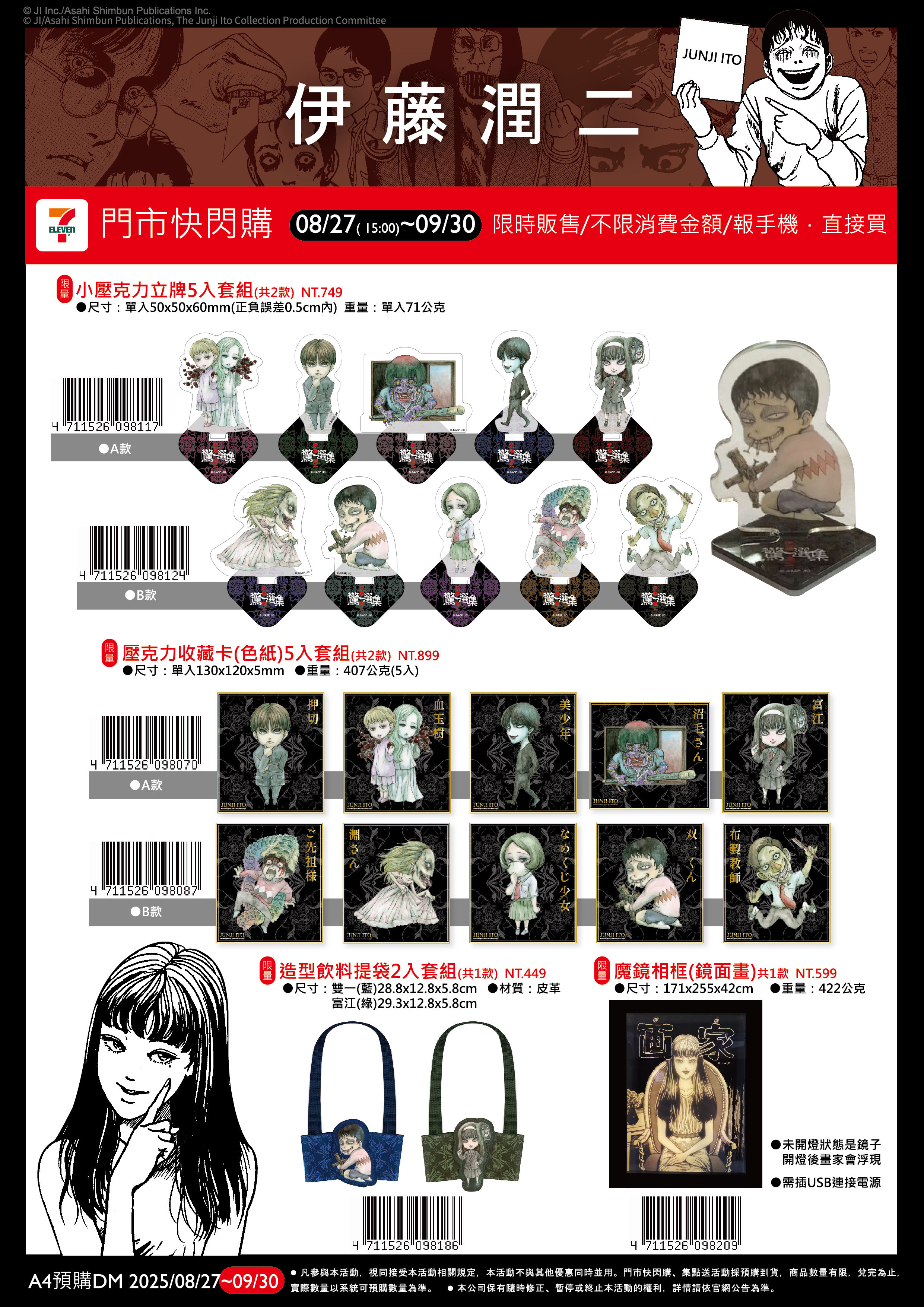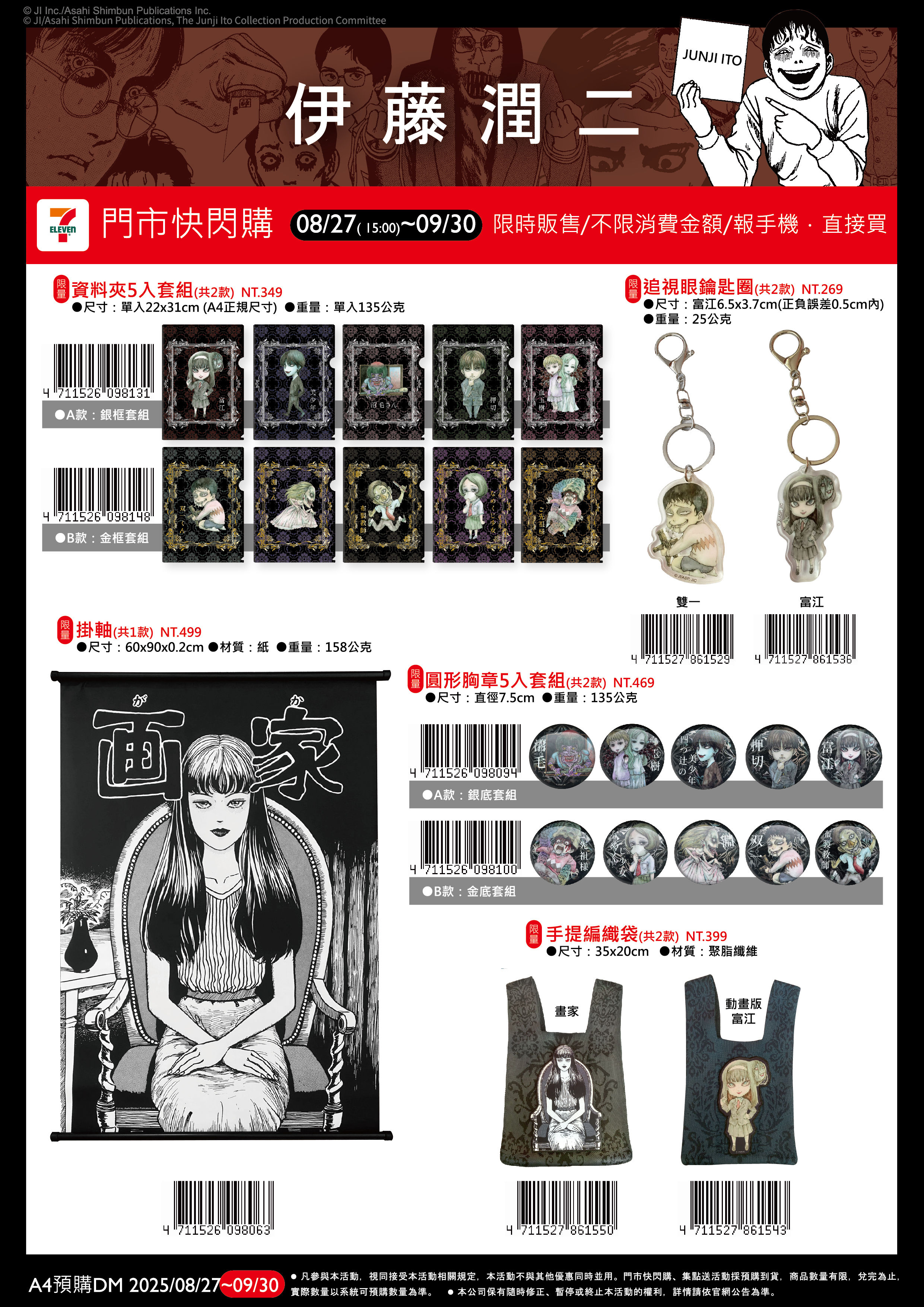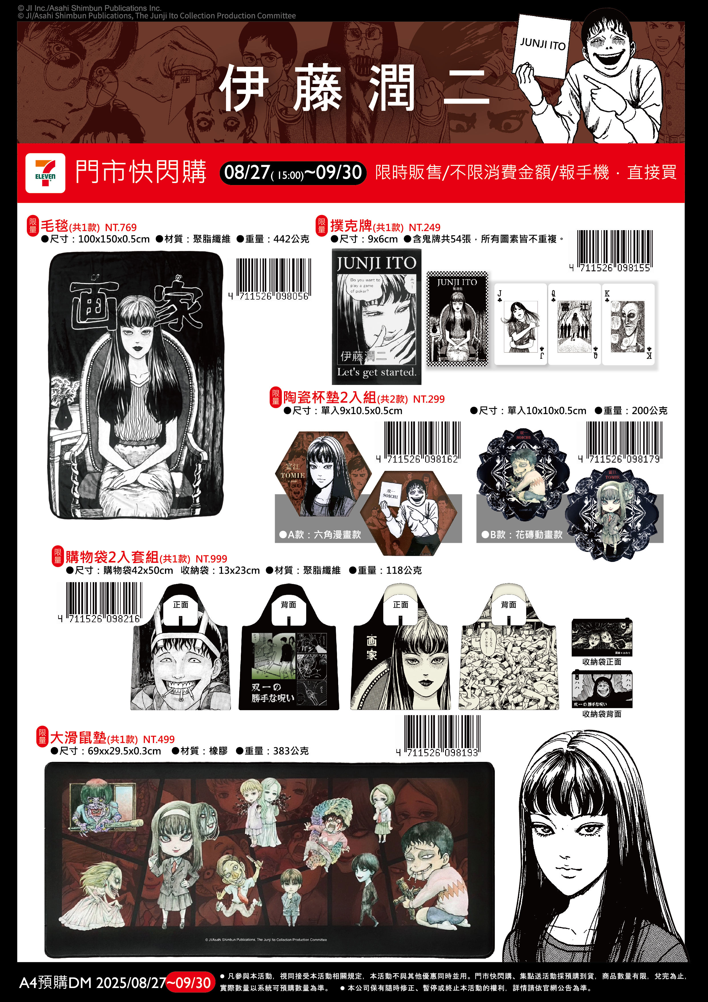 7-ELEVEN搶搭鬼門開、中元節話題,首度推出全店《伊藤潤二系列》精品活動,推出一系列詭譎恐怖美學周邊,陪粉絲辦公、讀書,8月27日下午3點起,全台7-11 展開限時「門市快閃購」活動,uniopen會員不限金額消費,最少只要249元起就能加購任一款。