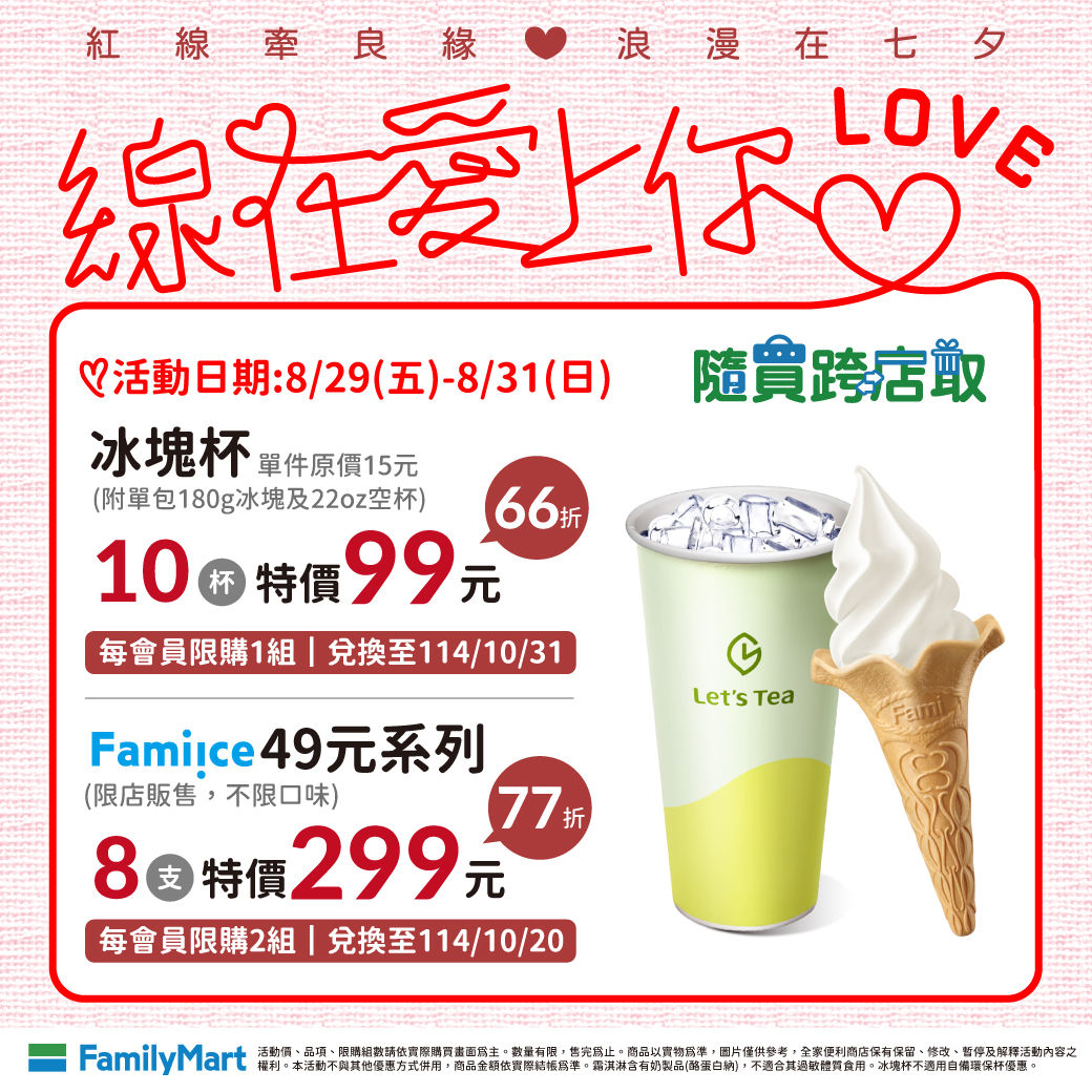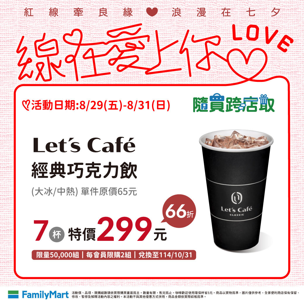 全家將於APP隨買跨店取推出七夕快閃優惠,8月29日至8月31日限時3天,推出Let’s Café大杯慢煮焦糖拿鐵7杯299元、Fami!ce霜淇淋8支299元、經典巧克力飲7杯299元等。