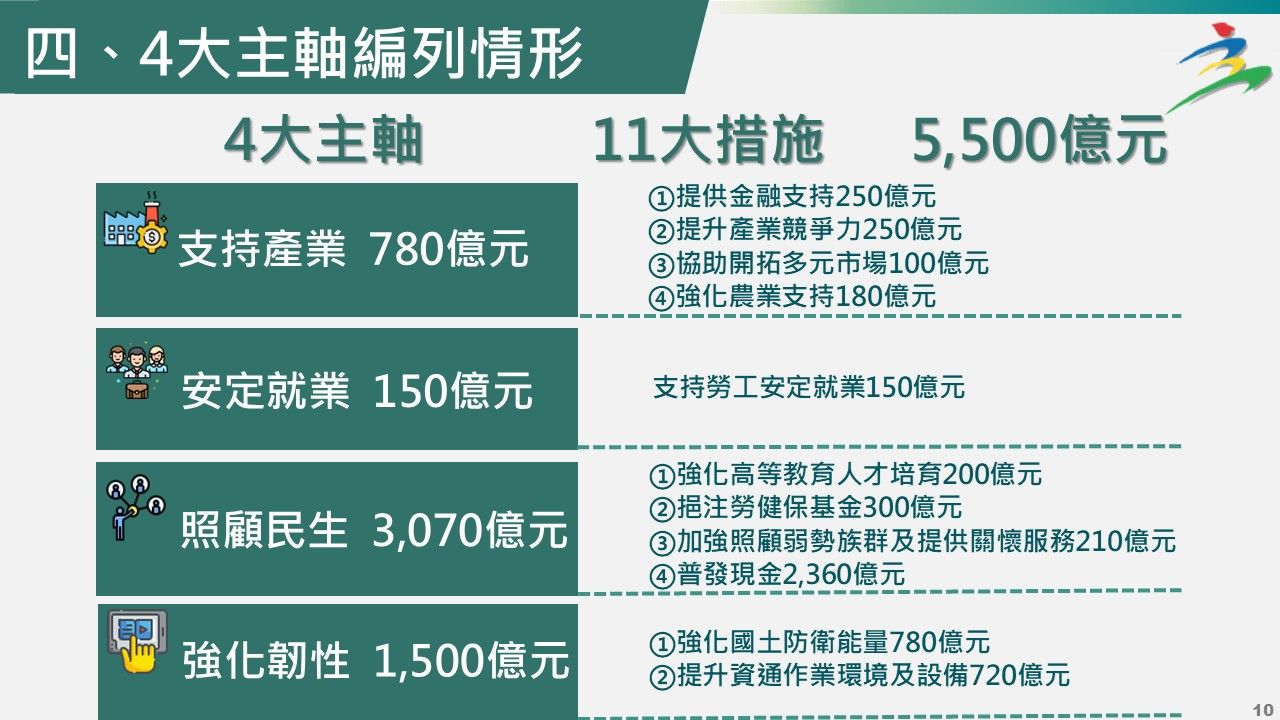 ▲行政院會拍板通過5700億(預留200億)民生國安韌性特別預算,詳列4主軸11措施。(圖/行政院主計總處提供,點圖放大)