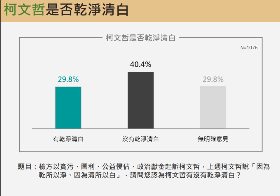《震傳媒》調查,詢問民眾「檢方以貪污、圖利、公益侵佔、政治獻金起訴柯文哲,上週柯文哲說因為乾所以淨、因為清所以白,請問您認為柯文哲有沒有乾淨清白」?結果顯示,29.8%受訪者表示柯文哲乾淨清白、40.4%表示沒有乾淨清白、 29.8%沒有明確意見。