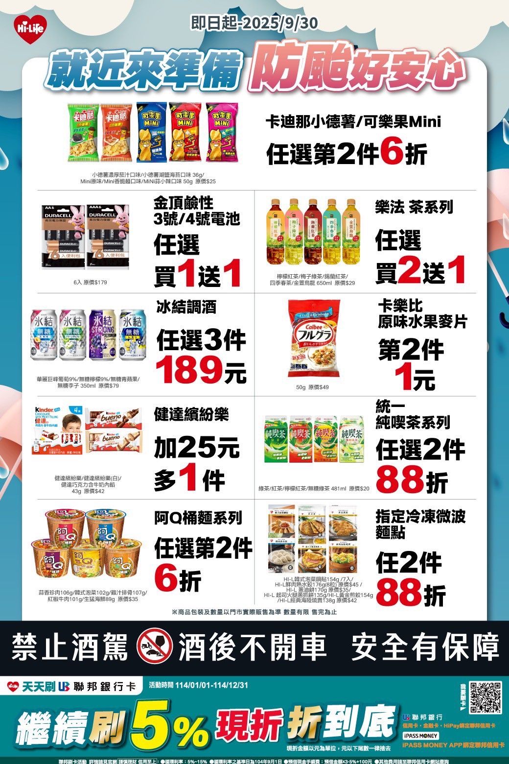 即日起至9月30日,萊爾富多款防颱必備商品祭出折扣,包括:阿Q桶麵系列「任選第2件6折」、HL冷凍微波麵點系列「任2件88折」。餅乾零食方面,卡迪那小德薯、可樂果Mini系列「第2件6折」,健達繽紛樂「加25元多1件」。