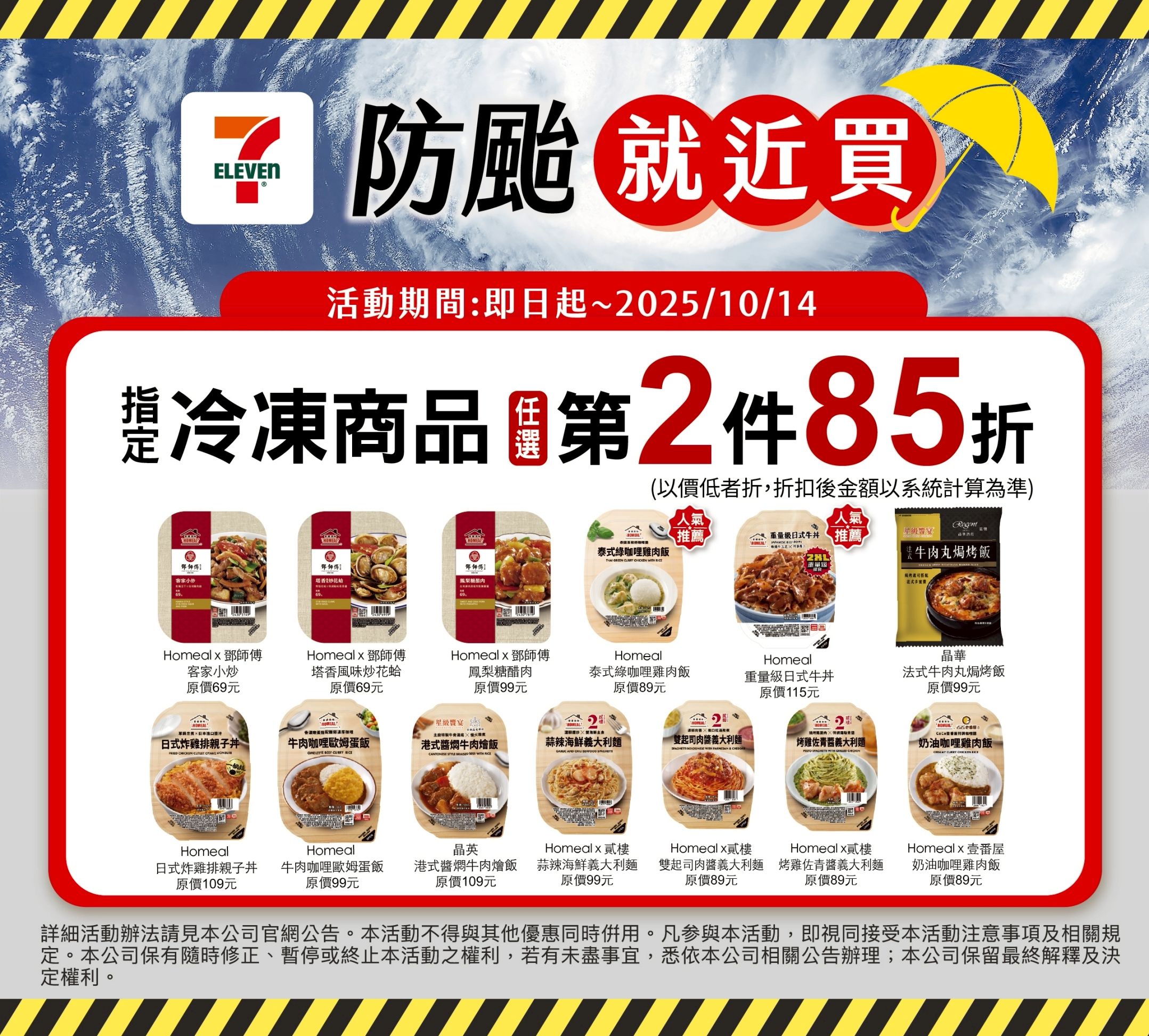 7-11即日起至10月14日,自有鮮食品牌「Homeal」米飯及麵食類商品,推出「第2件85折」優惠,推薦如「泰式綠咖哩雞肉飯」、「日式牛丼」等主餐。還有與美式餐廳「貳樓」合作開發的多款義大利麵,售價89元起。