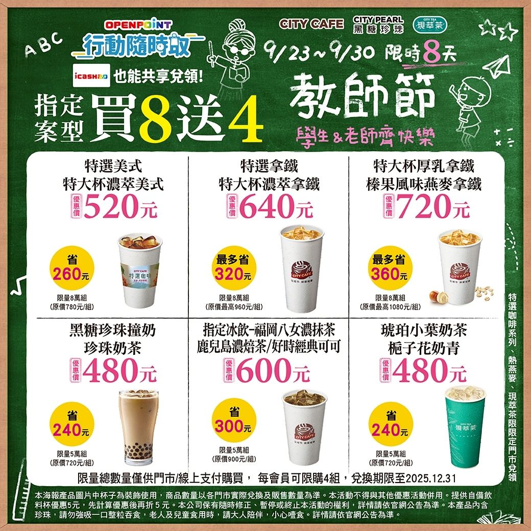 OPENPOINT行動隨時取則於即日起至9月28日,推出「秋賞CITY風味」活動,CITY CAFE、CITY TEA指定飲品組合最低520元。9月23日至9月30日則推出「教師節快樂」活動,特選咖啡及奶茶系列「買8送4」。
