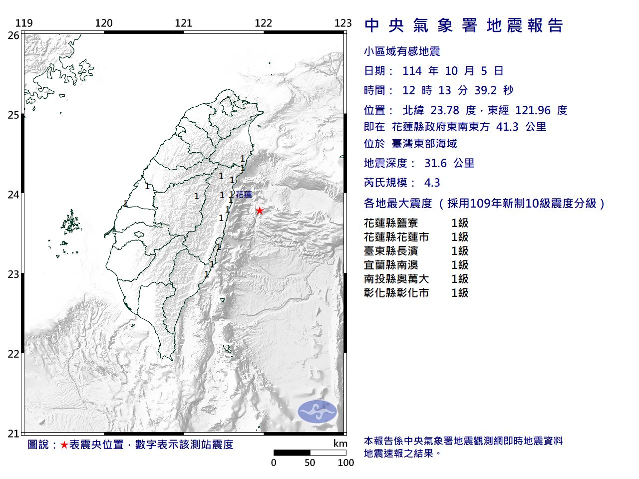 根據氣象署測報資料,震度1級地區為花蓮縣、台東縣、宜蘭縣、南投縣、彰化縣。