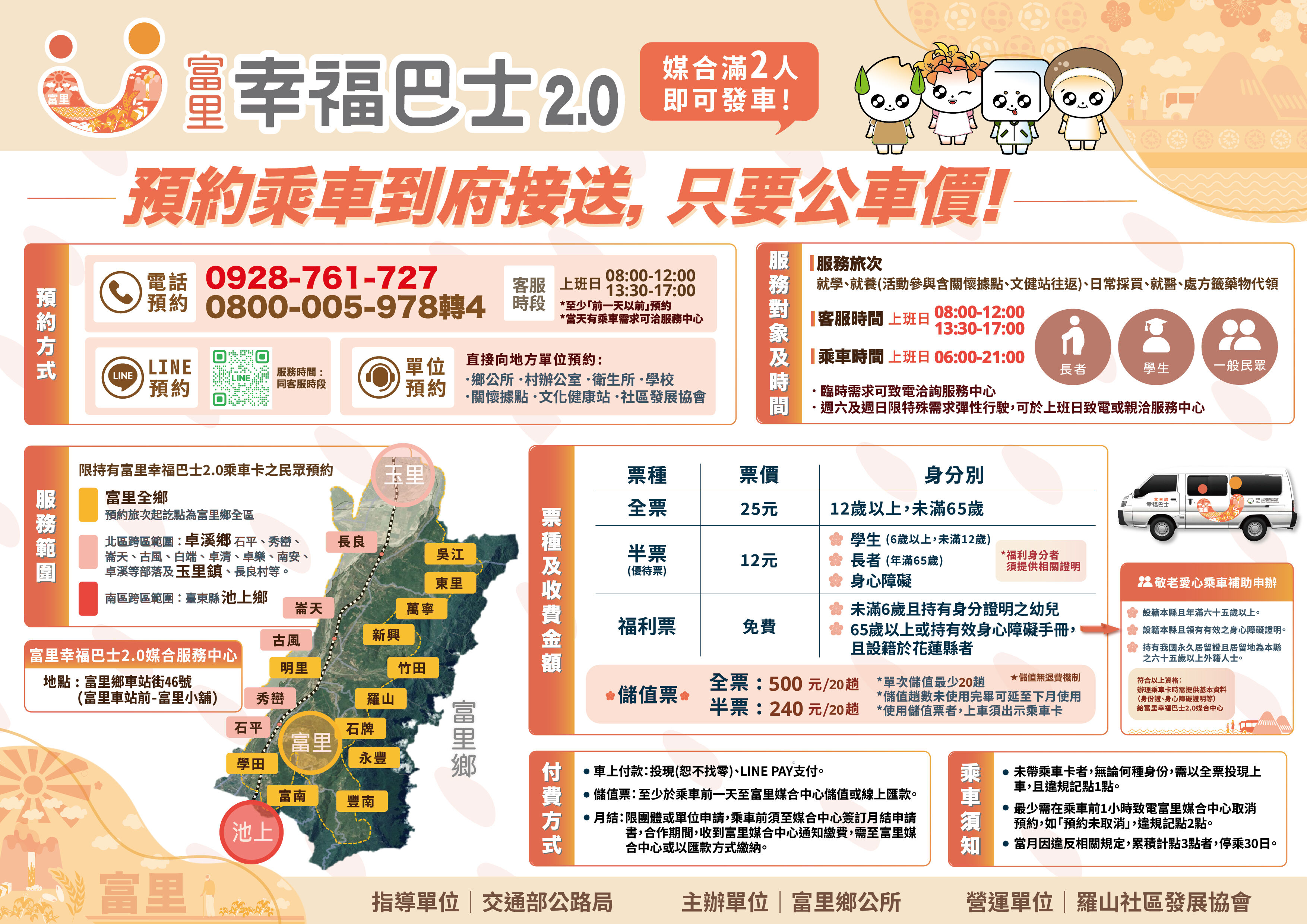 花蓮縣政府表示,為了讓幸福巴士服務更貼近民眾需求並提升行車安全,富里幸福巴士車輛增加車身統一識別、車內外監視器、酒測系統等,搭民眾更安心搭乘。未來將持續結合地方文化與交通服務,透過更多創新設計與貼心服務,讓「幸福」不只是交通工具,更成為連結社區、傳遞情感的美好象徵,歡迎鄉親持續搭乘富里幸福巴士。