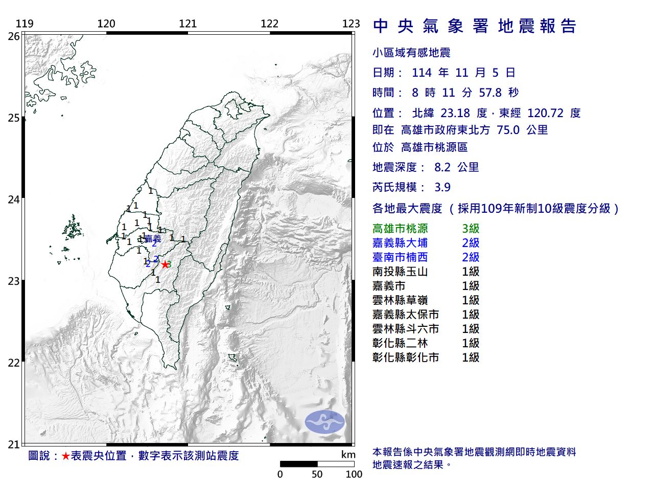 ▲上午8時11分,高雄市桃源區發生芮氏規模3.9自地震。(圖/氣象署提供)