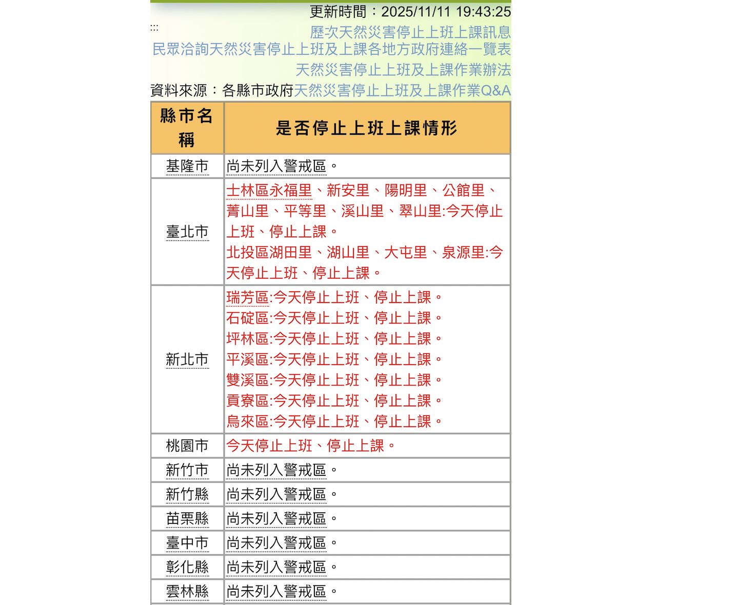 11日下午16時許,縣長張麗善召集各局處長於消防局召開一級緊急應變中心會議,裁示晚間20點正式公布是否停班課。未料19點48分人事行政總處官網率先亮出「雲林縣停止上班、停止上課」公告,但卻5分鐘後又變成「尚未列入警戒區。」正當民眾一頭霧水時,這同一時間,張麗善臉書專頁出現「依中央氣象署資料,未達停班課標準,11月12日照常上班上課」貼文。
